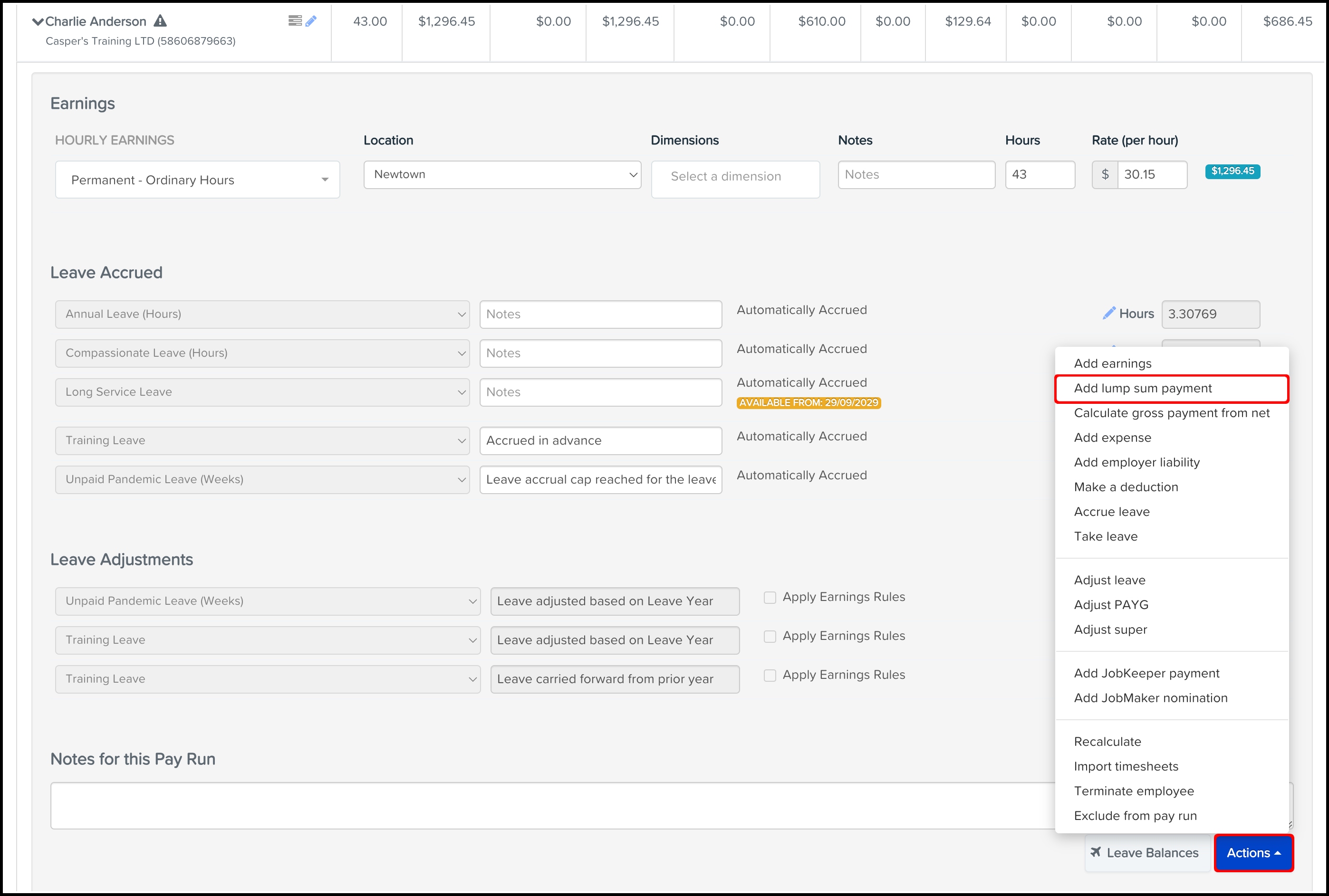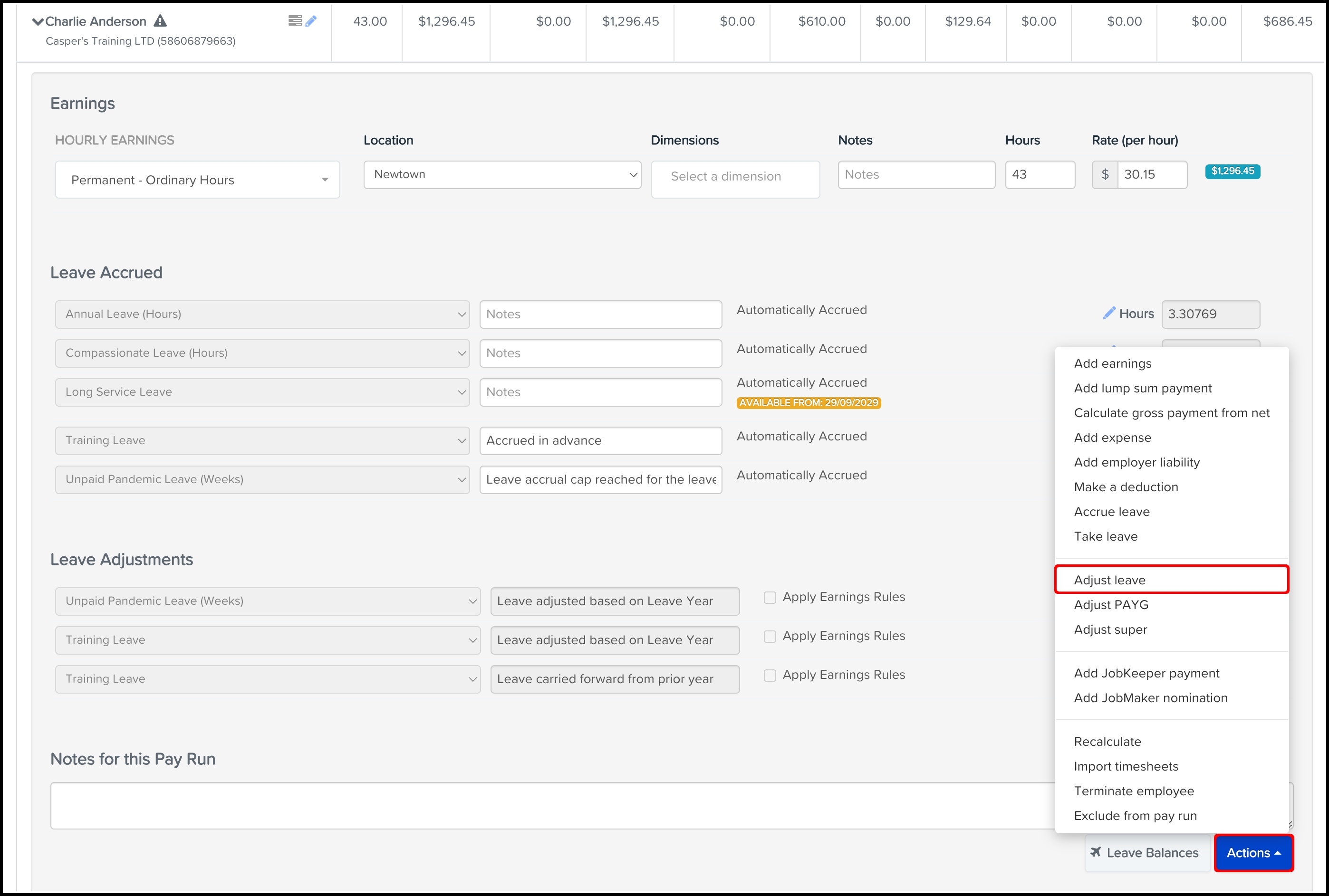 - Use the Adjust PAYG option from the Actions button to adjust the amount of PAYG to be deducted.