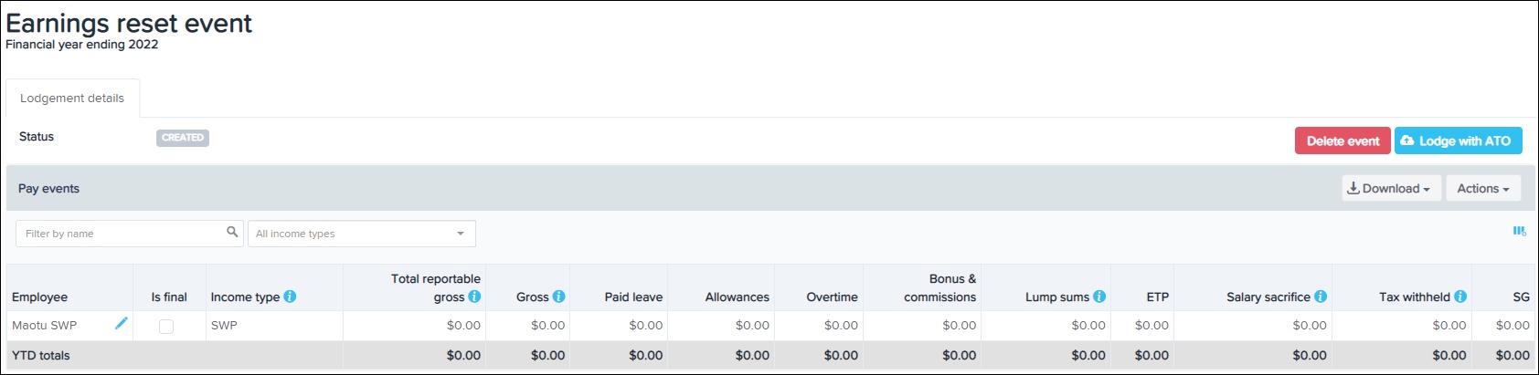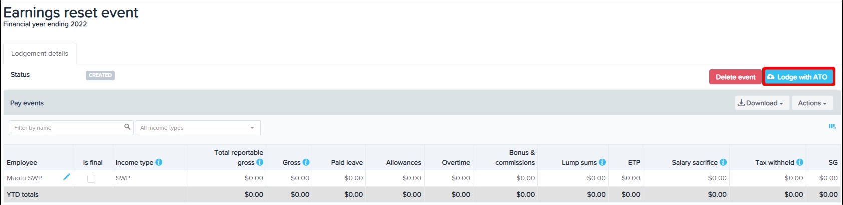 - Once the event is successfully lodged, you can rectify the business/employee issues and re-lodge the actual employee earnings with the ATO.