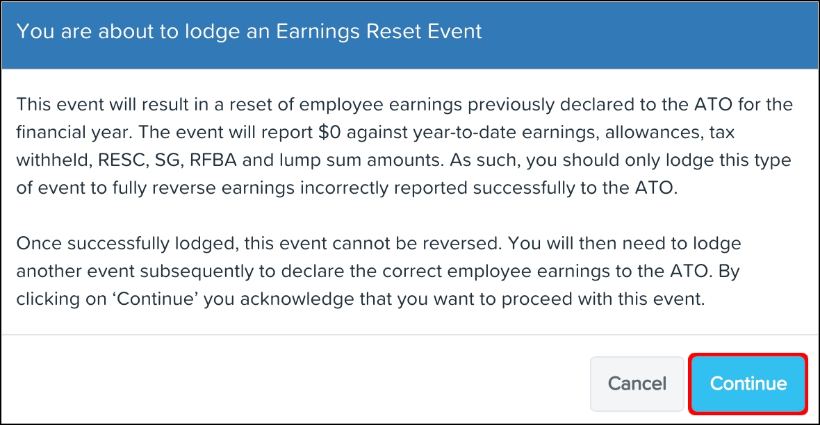- Click the Continue button to acknowledge the consequences of lodging an earnings reset event.