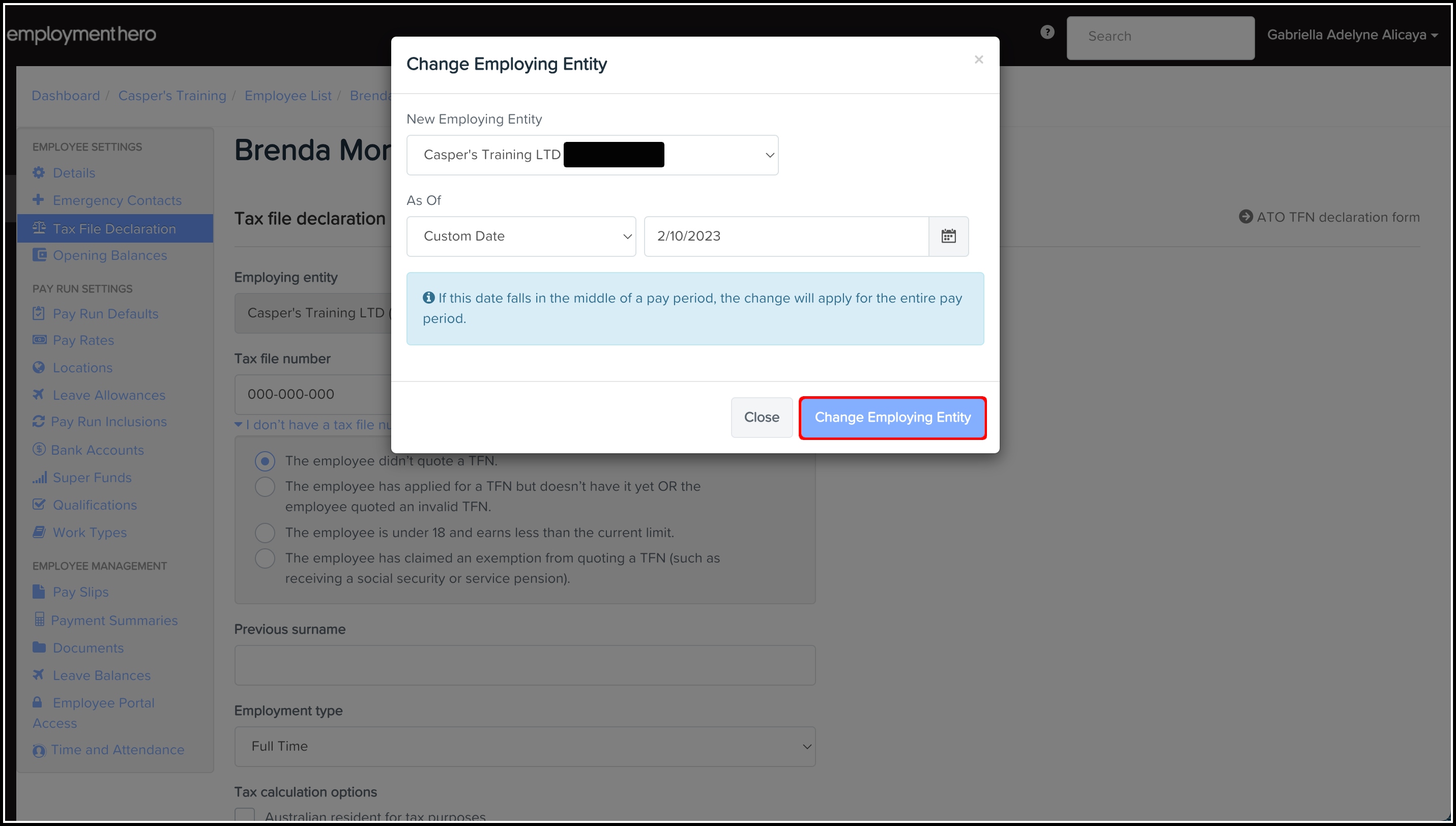 - Click the Change Employing Entity button.