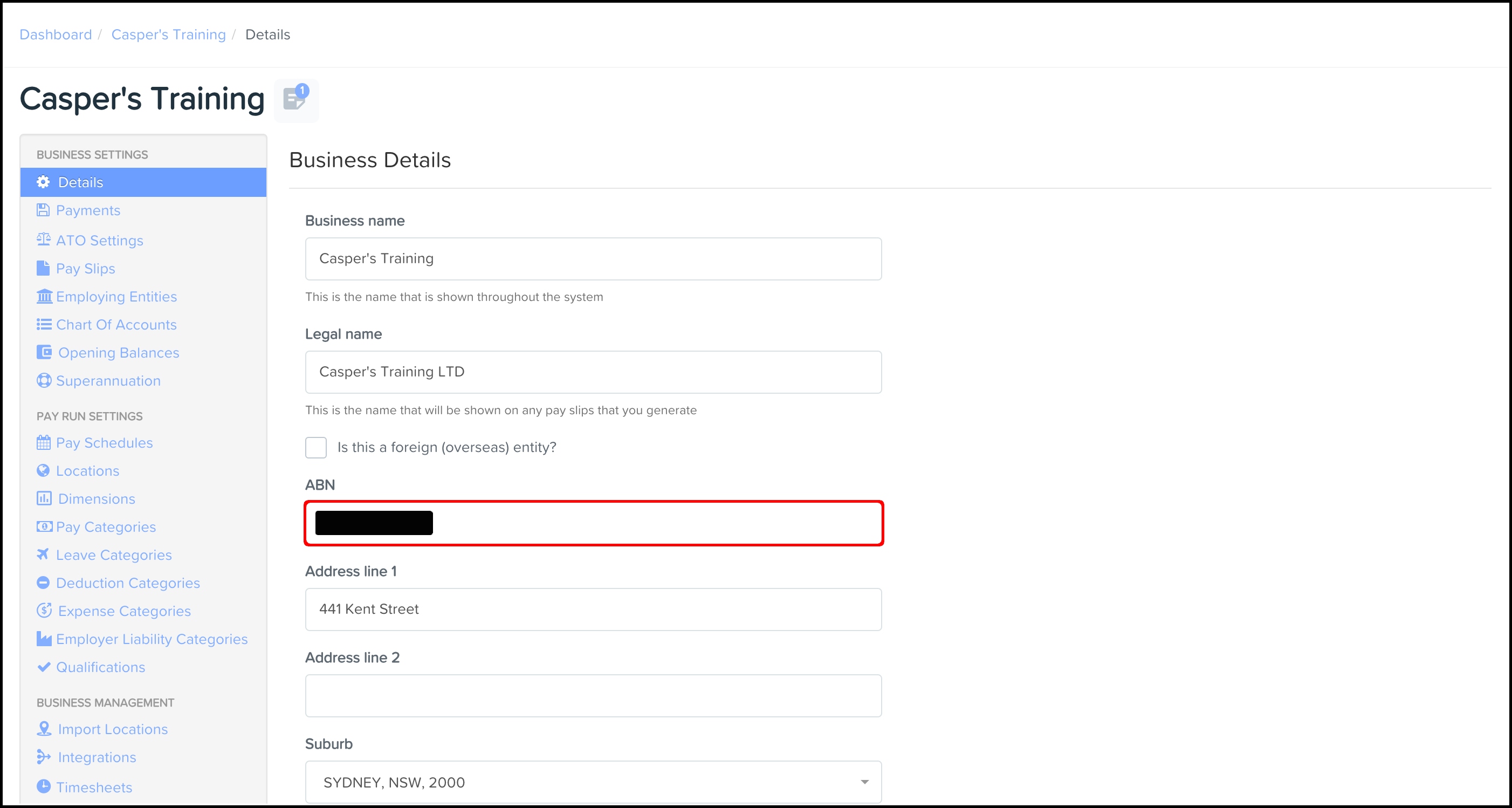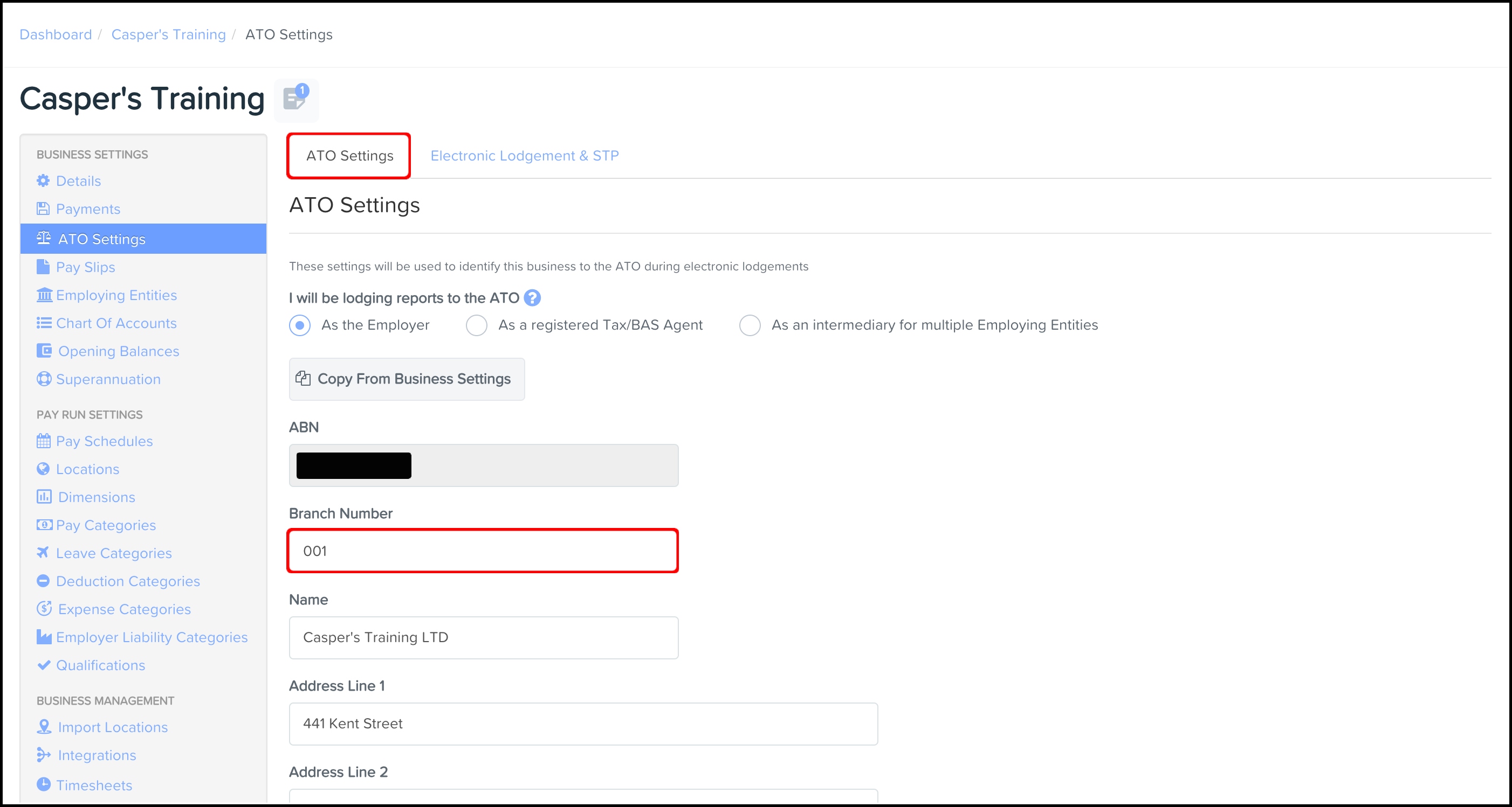 To correct the ABN of an employing entity:- Under Business Settings, click Employing Entities.
