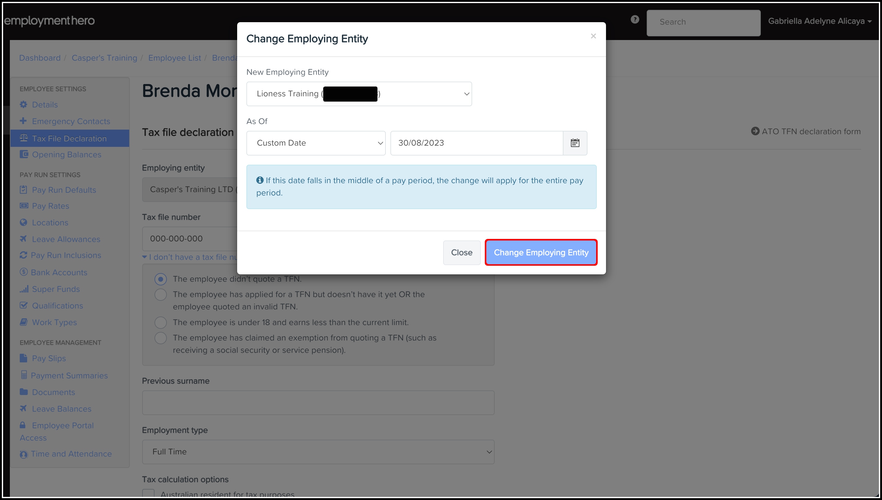 - Select the current business entity under New Employing Entity.