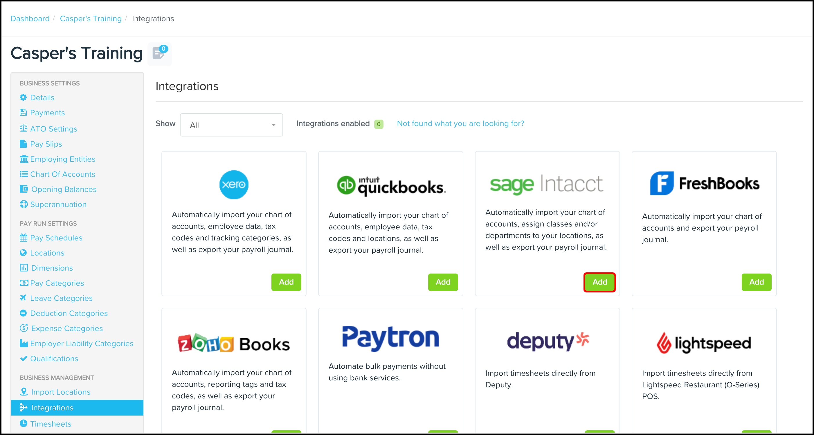 screenshot of the integrations screen, highlighting the add button for sage intacct