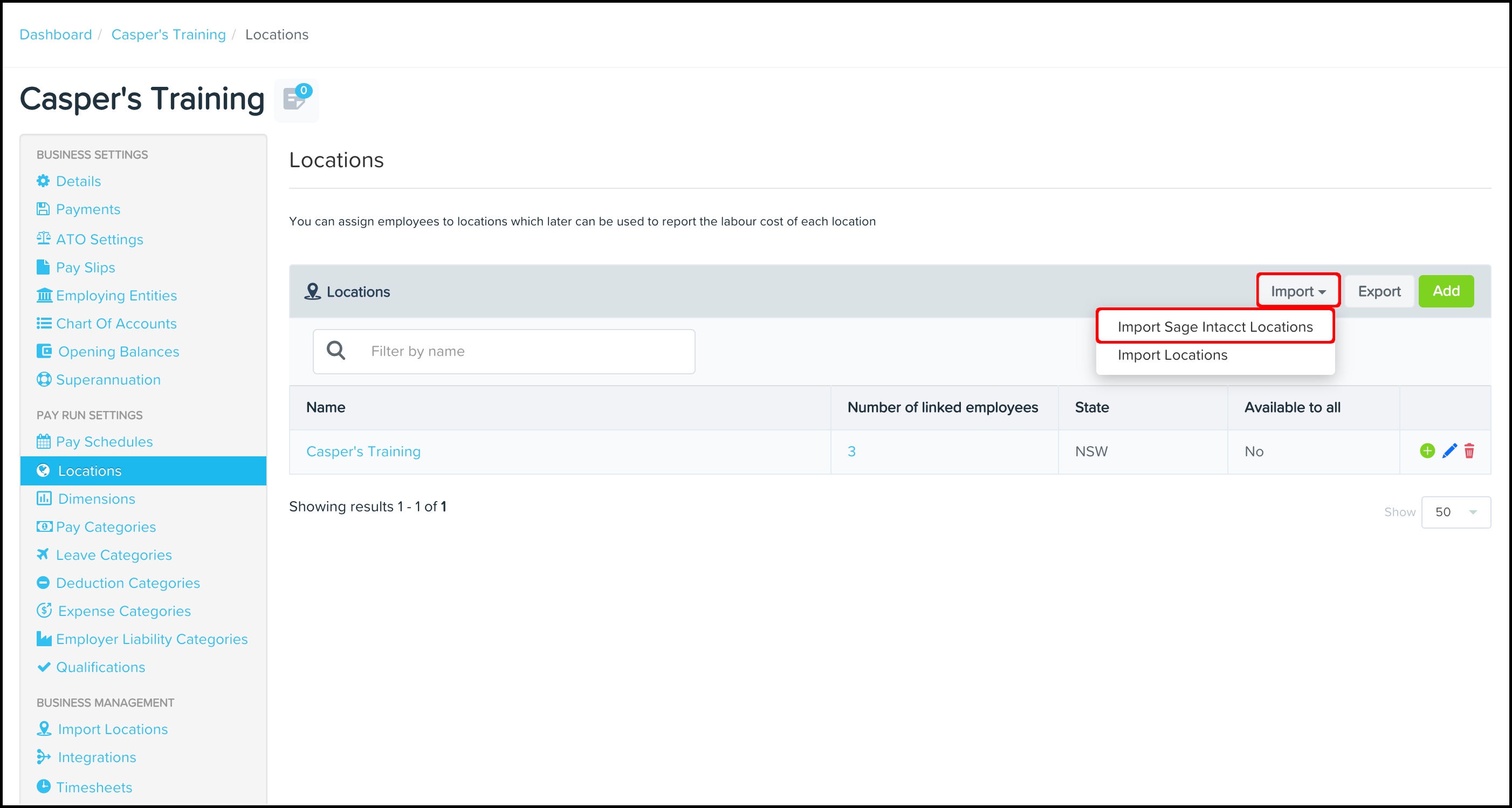 The purpose of assigning these dimensions to your locations is to then assign the locations to your employees, and the pay run totals will be amalgamated and flow through to your dimensions in Sage Intacct with your pay run journal.