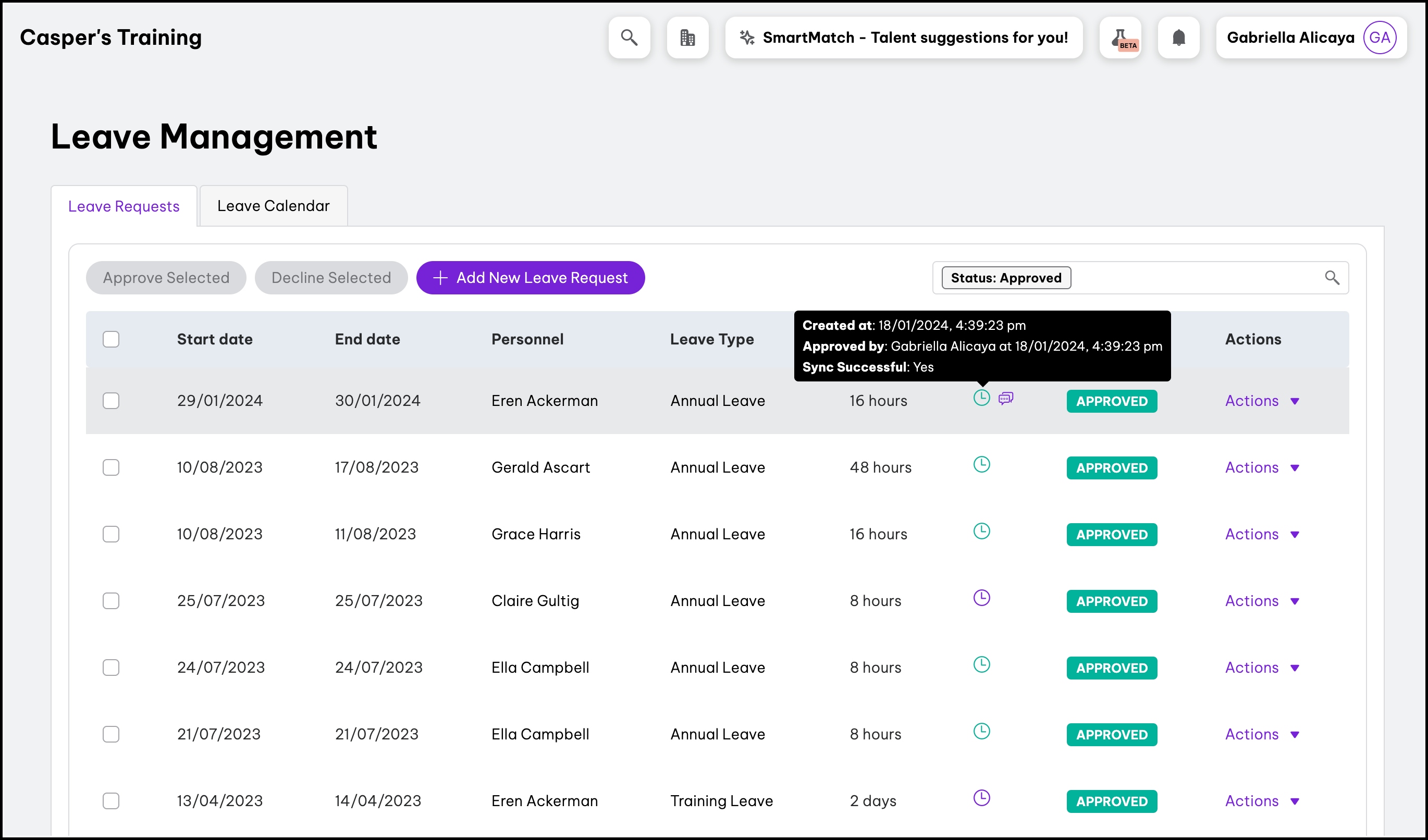 Let us take an example where admin Gabriella Adelyne Alicaya approved a leave request for employee Eren Ackerman on Employment Hero.