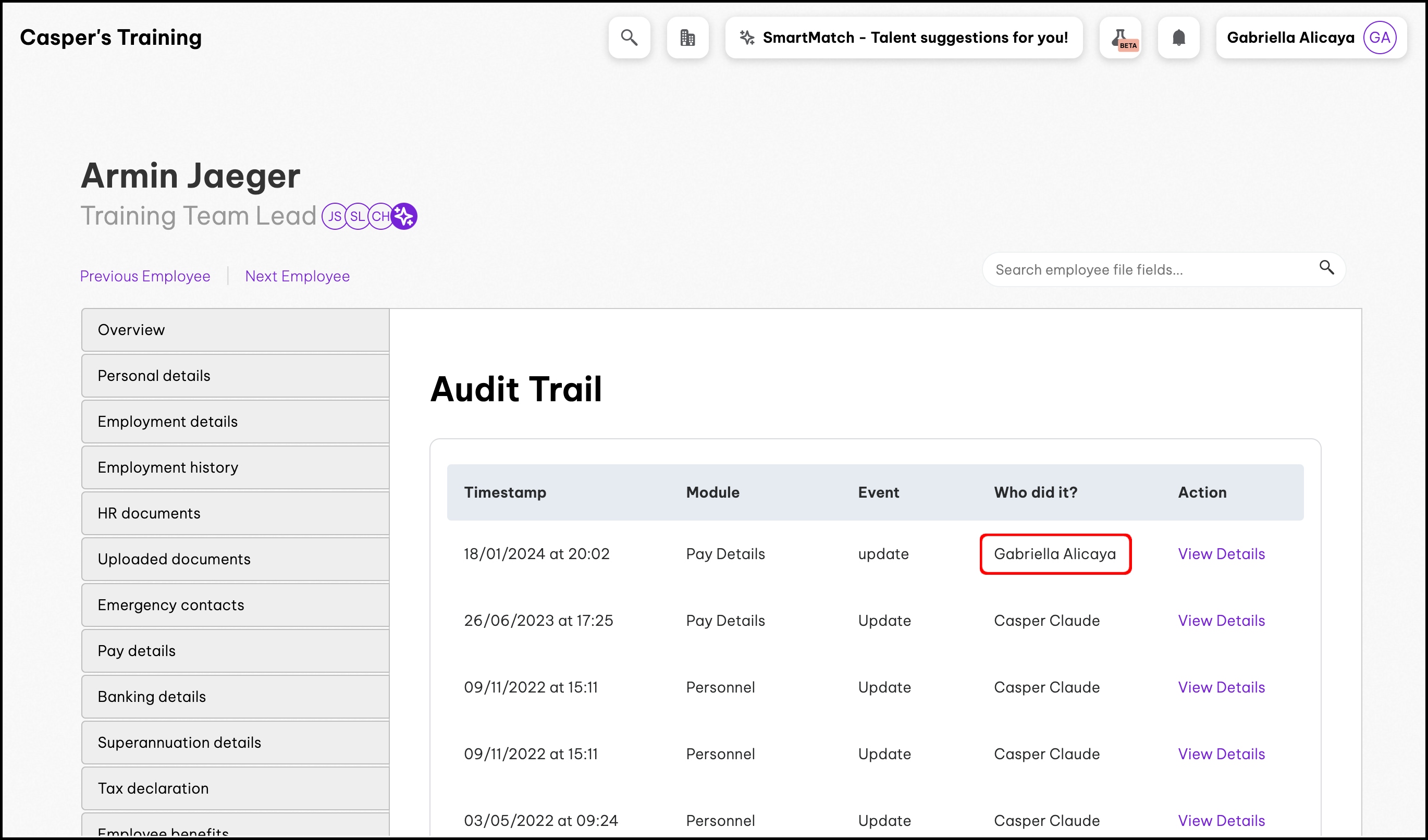In this example, admin Gabriella Alicaya changed the pay details for employee Armin Jaeger. On Employment Hero, the "Who did it?" column (in the Audit Trail tab in the Employee File) will show the name of the person who made the change.