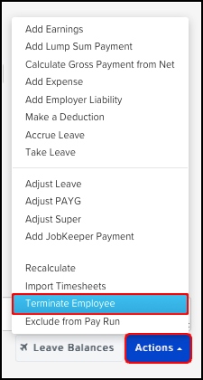 Ensure the employee has been added to the pay run, click on the employee within the pay run, then click the 'Actions' button and select 'Terminate employee'.