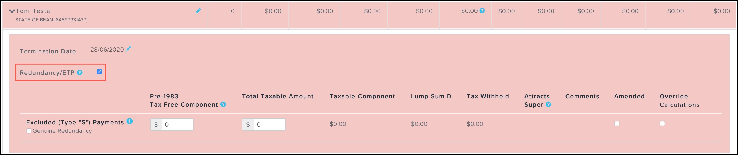 Once the ‘Terminate employee’ action has been selected, tick the ‘ETP/Redundancy’ checkbox to activate the ETP earnings lines: