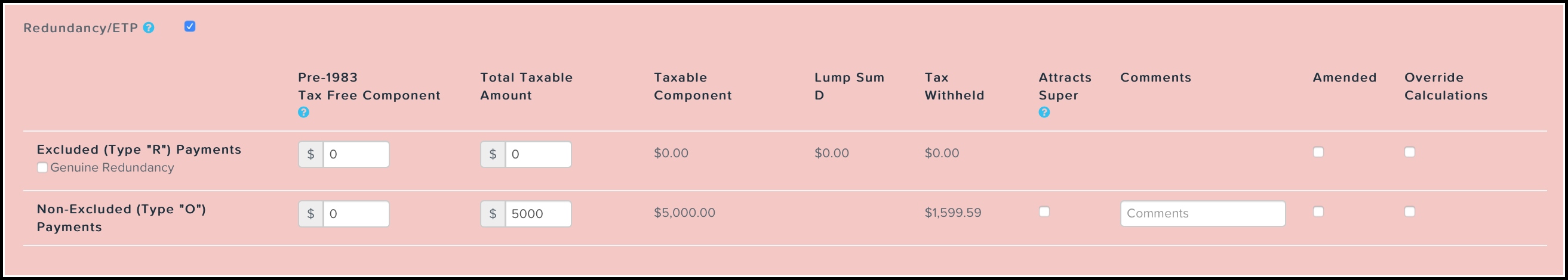 Because a payment in lieu of notice is superable, you need to tick the ‘Attracts super’ checkbox to calculate the superannuation guarantee (SG) on the amount entered in this row.