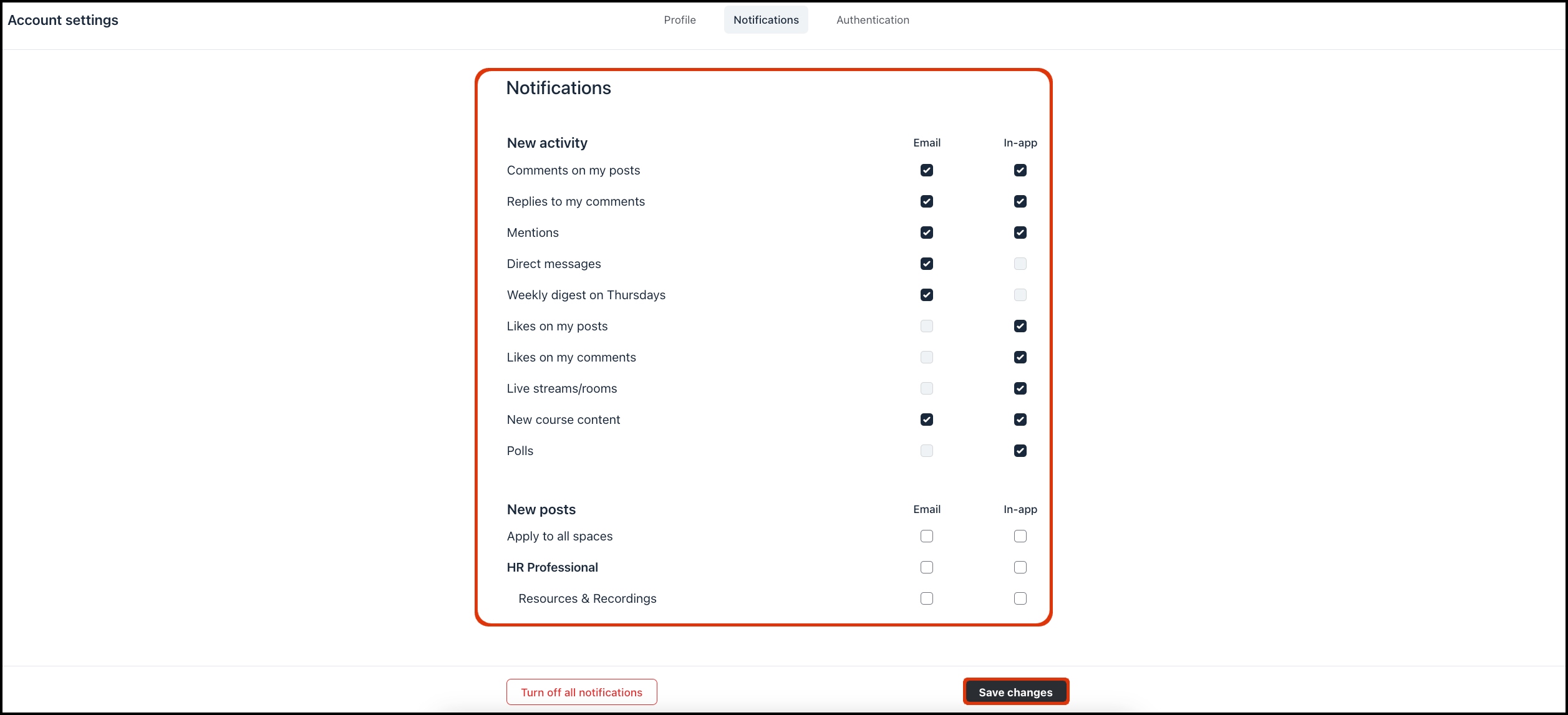 Select the checkboxes depending on whether you would like to receive emails or in-app notifications for each specific activity/post.