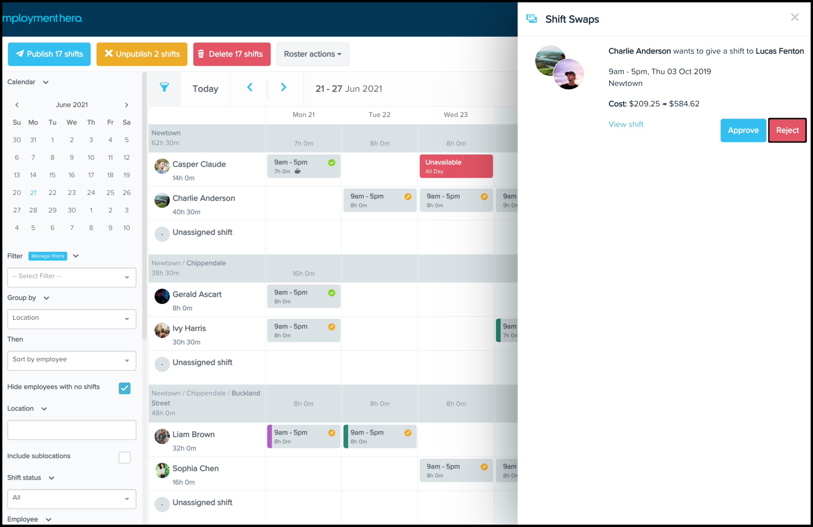 - Swapped shifts always require manager approval: In this scenario, when an employee accepts a shift swap the shift will need to be approved by the manager before it is reassigned in the roster to the employee who accepted the swap.