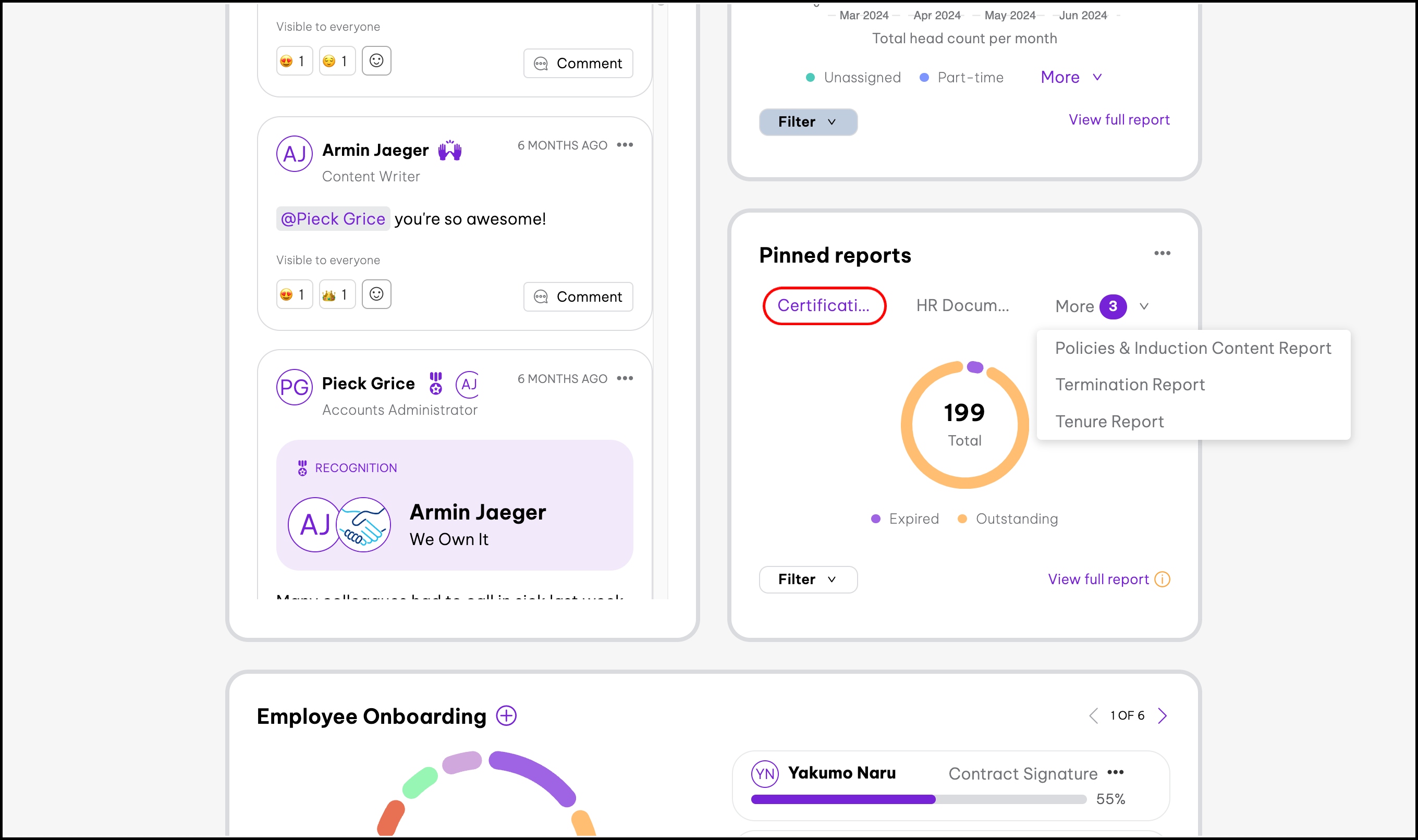 You can pin reports to your dashboard using the Pinned Reports widget. This feature lets you have easy access to up to five reports, depending on what you need, and arrange them based on importance. You can pin Policies and Induction Content, Certifications, HR Documents, and Tenure Reports, along with your Workforce Snapshot or your Termination, Work Eligibility, and Tax Reports.