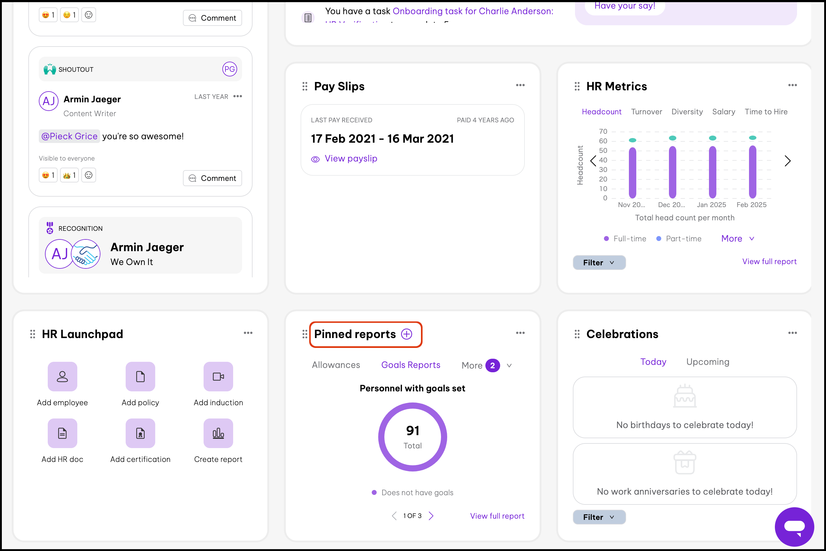 - Reviewing the widgets on your dashboard This article covers the other widgets on your dashboard, such as the goal insights or HR metrics widgets.