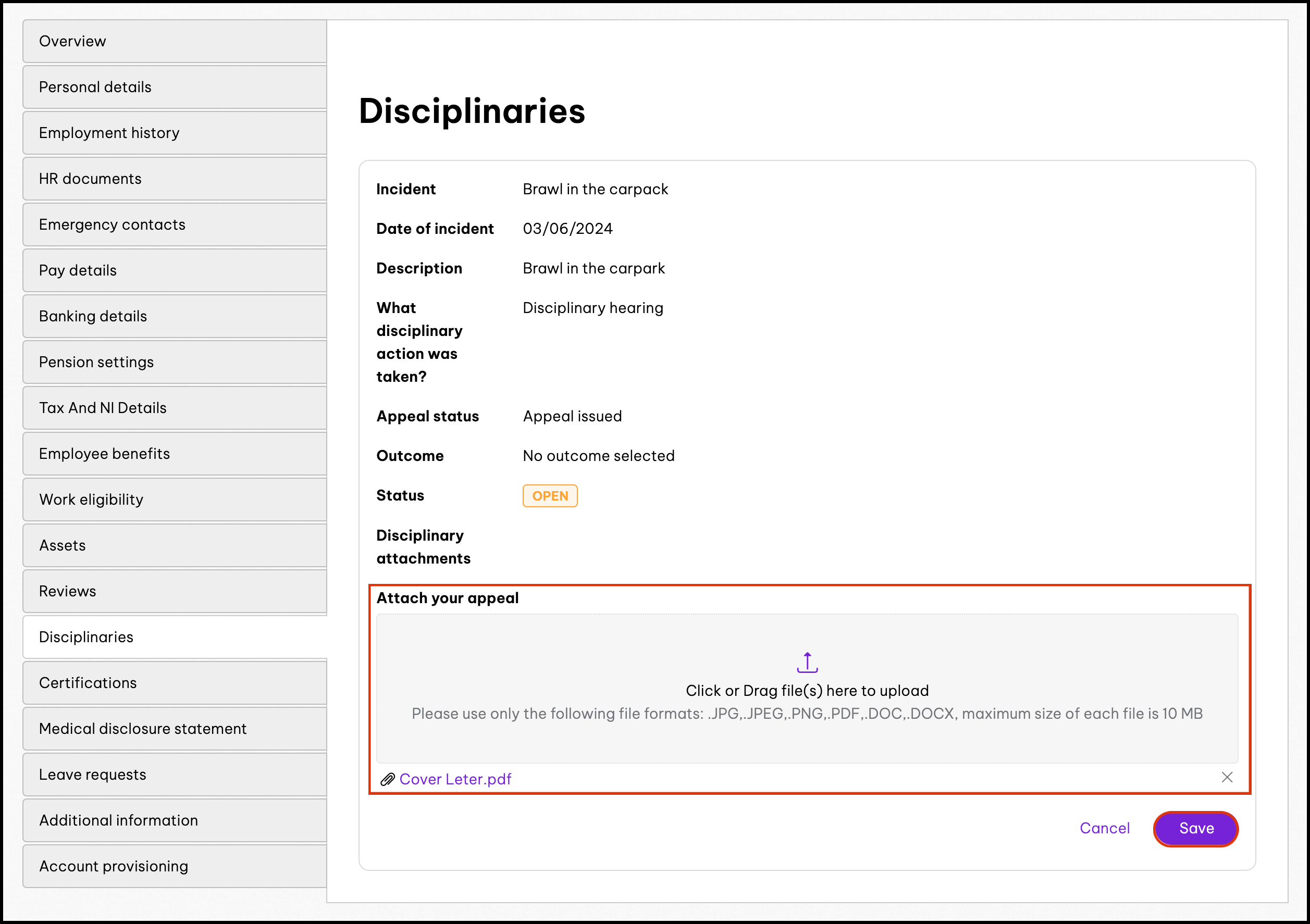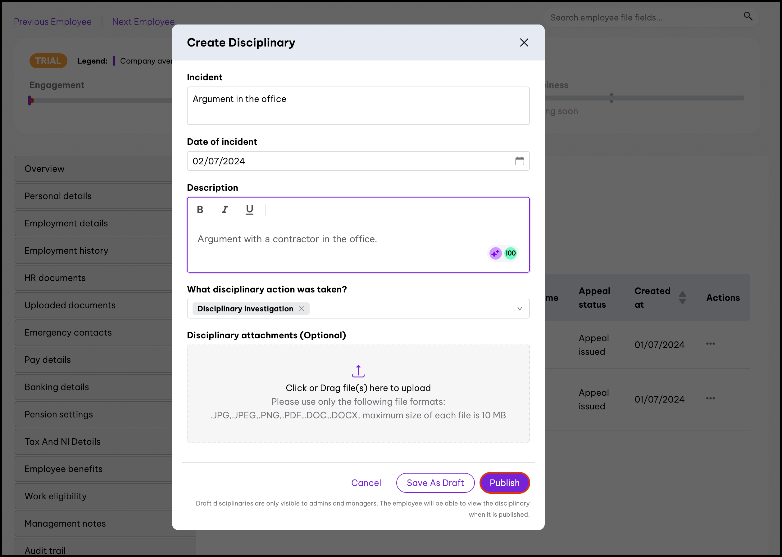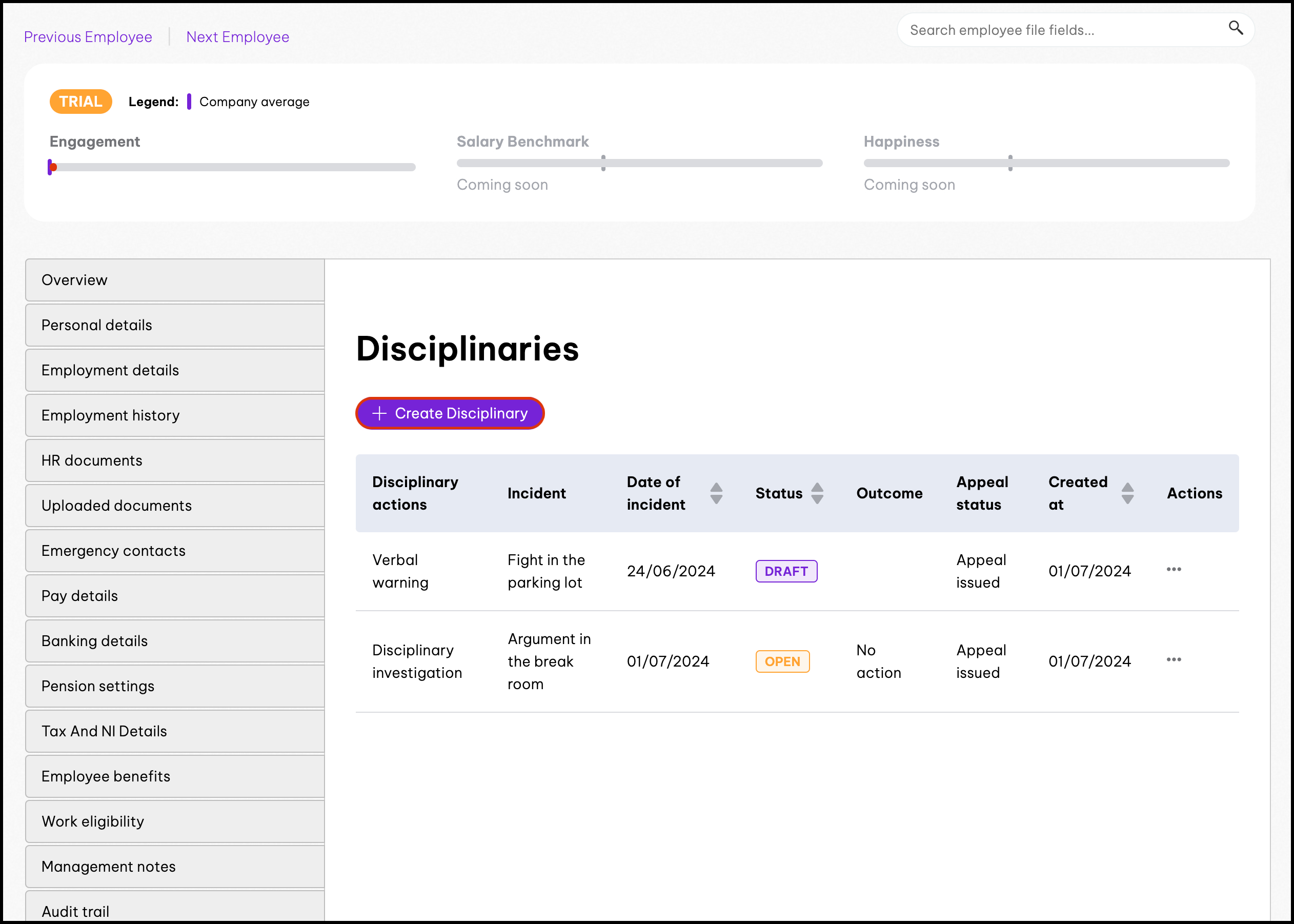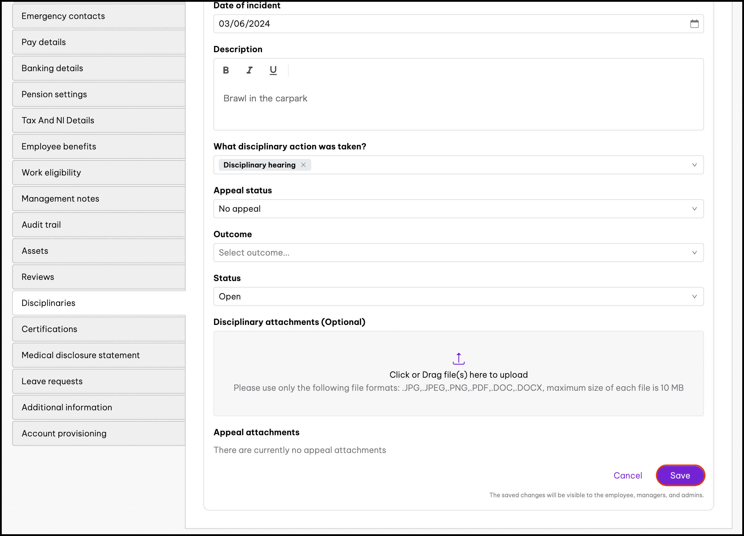 Admins and managers can use the Disciplinary Management feature to create disciplinary actions for their employees. You can add the disciplinary action-taken, date of the incident, and any needed attachments to each record. Your employees can also appeal the disciplinary action within their profile as well by uploading appeal letters.