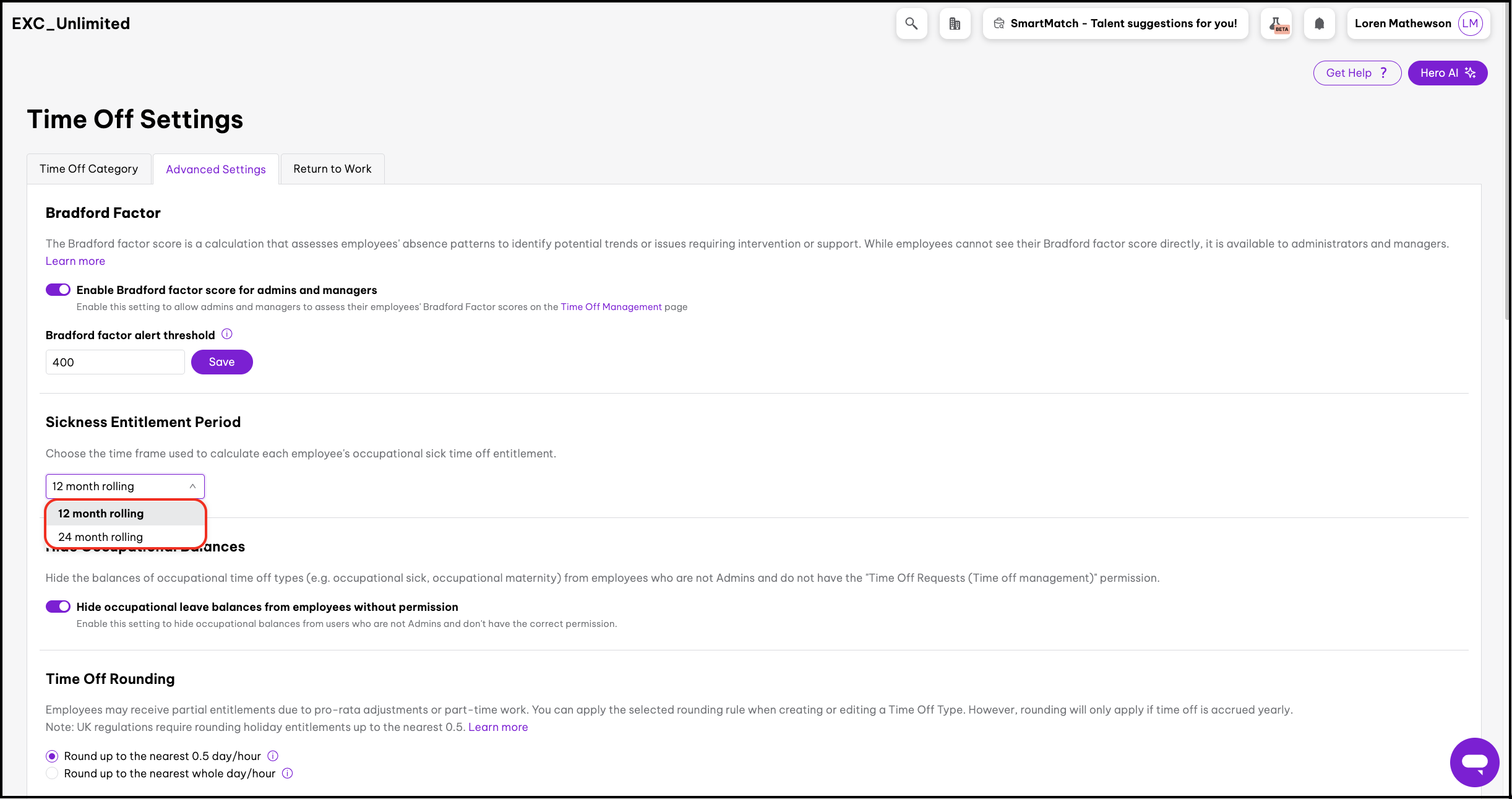 Please note that only one policy can be created per occupational time off type. Also, the sickness entitlement period is set to the default value of 12 month rolling, and can be configured between 12 and 24 months via Time Off Settings Advanced Settings Sickness entitlement period. You can find an end-to-end video tutorial here.