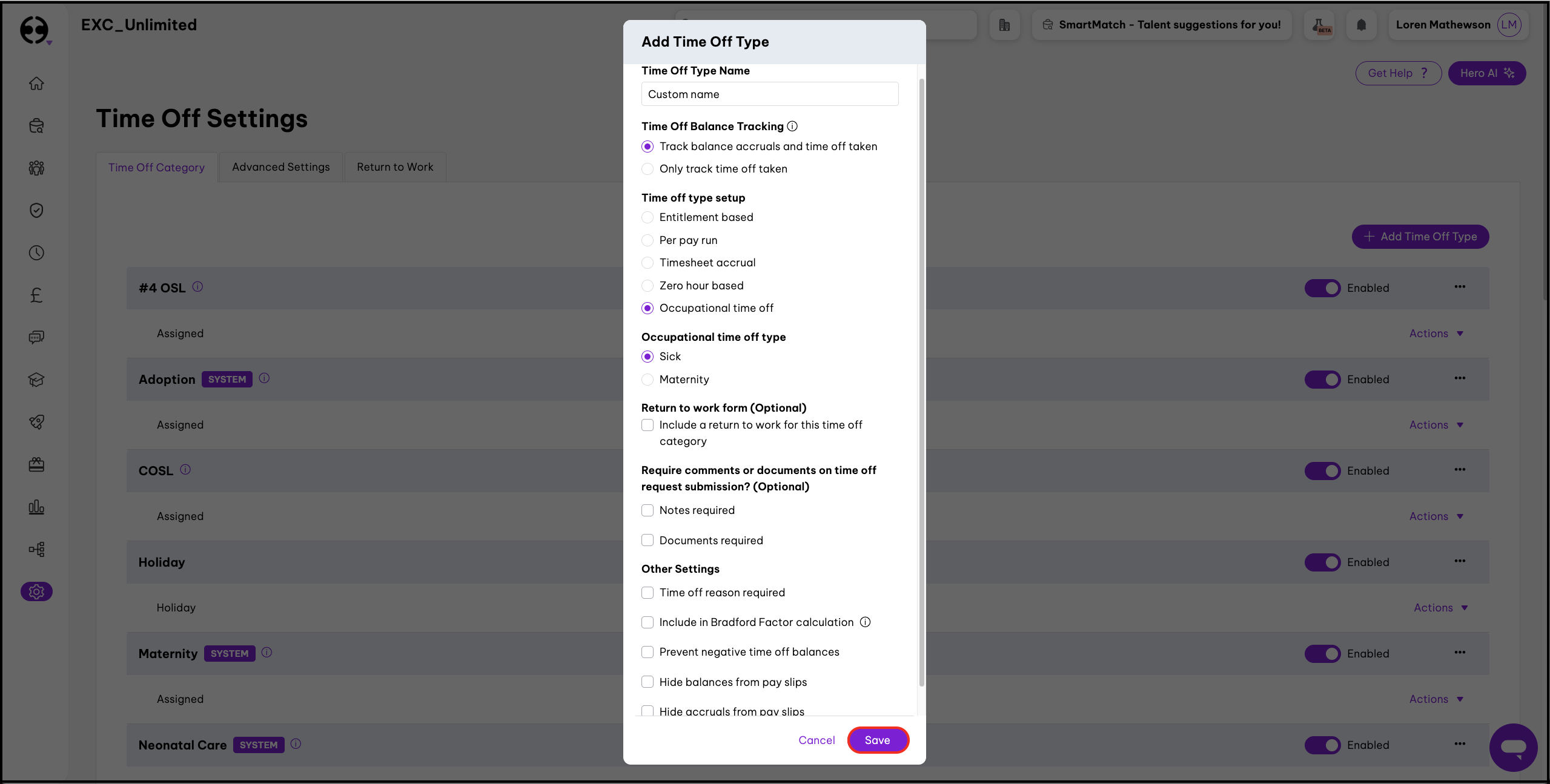 - Change this to Maternity if you wish to create an Occupational Maternity Leave (OML) type.