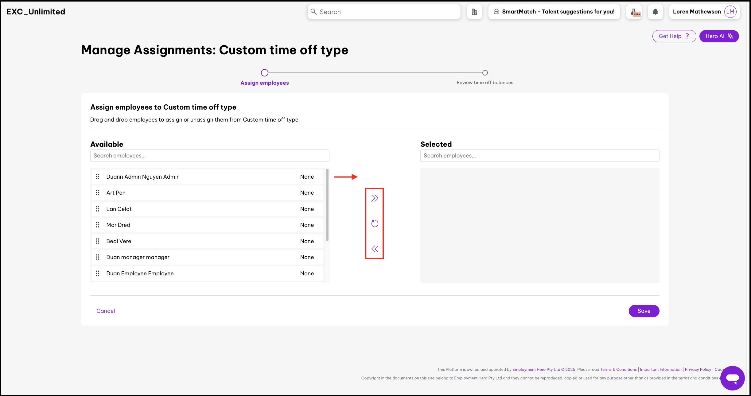 Assign this time off type to your employees by sliding across the employees you wish to add to the Selected column. Assign individual employees by using the drag and drop method, or assign all employees by clicking on the double arrows to the right.