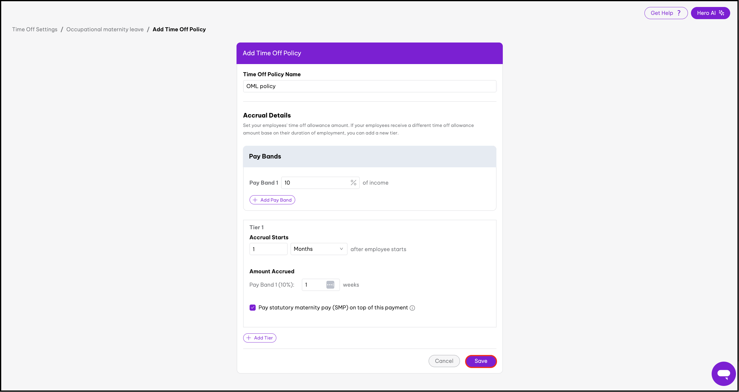 - Accrual Starts: Enter the number of years/months that the accrual of occupational maternity time off will commence (e.g. 0 years after start date if the employee is entitled to occupational maternity pay from day 1 of employment).