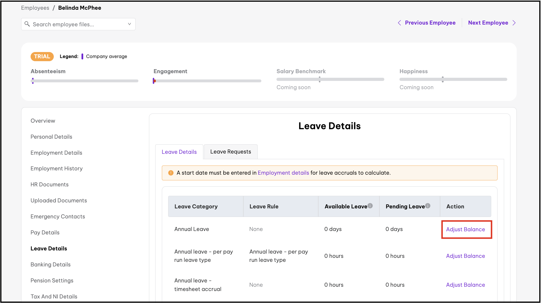- How do I adjust leave balances?The adjust balances feature lets you update employee leave balances when required.