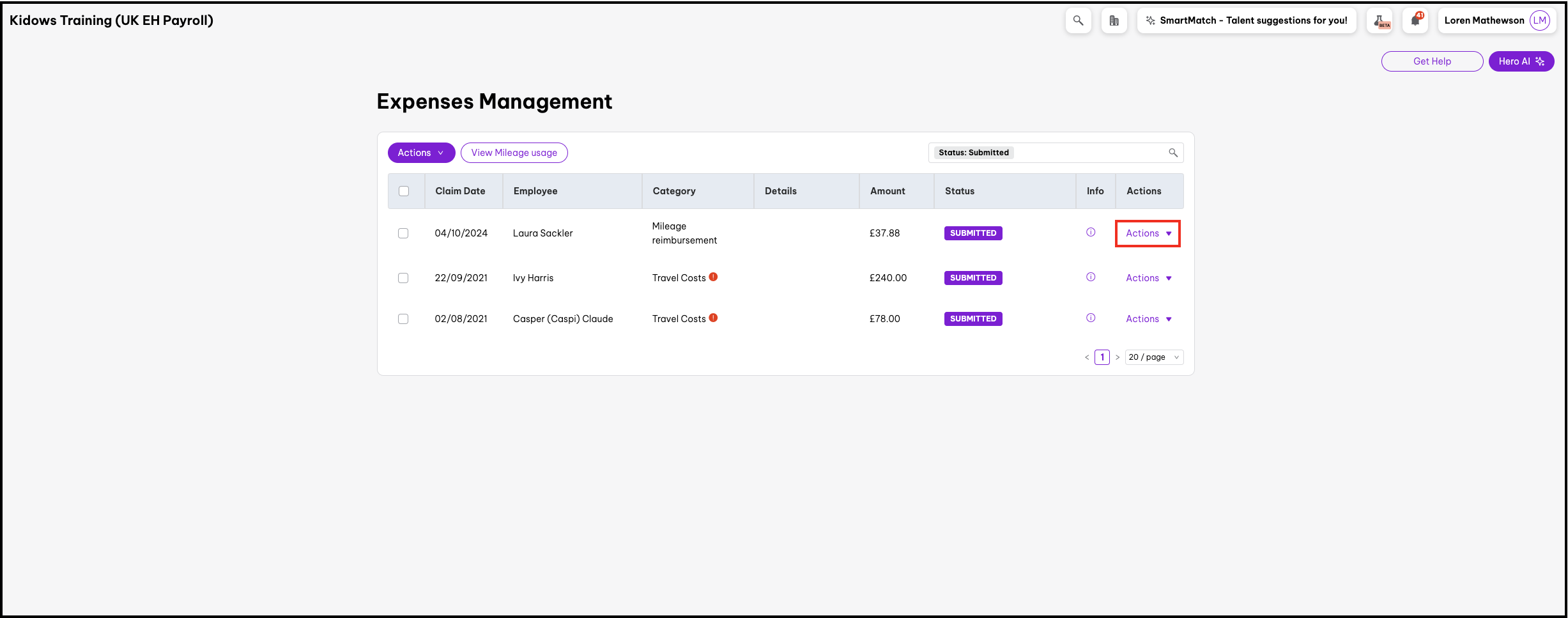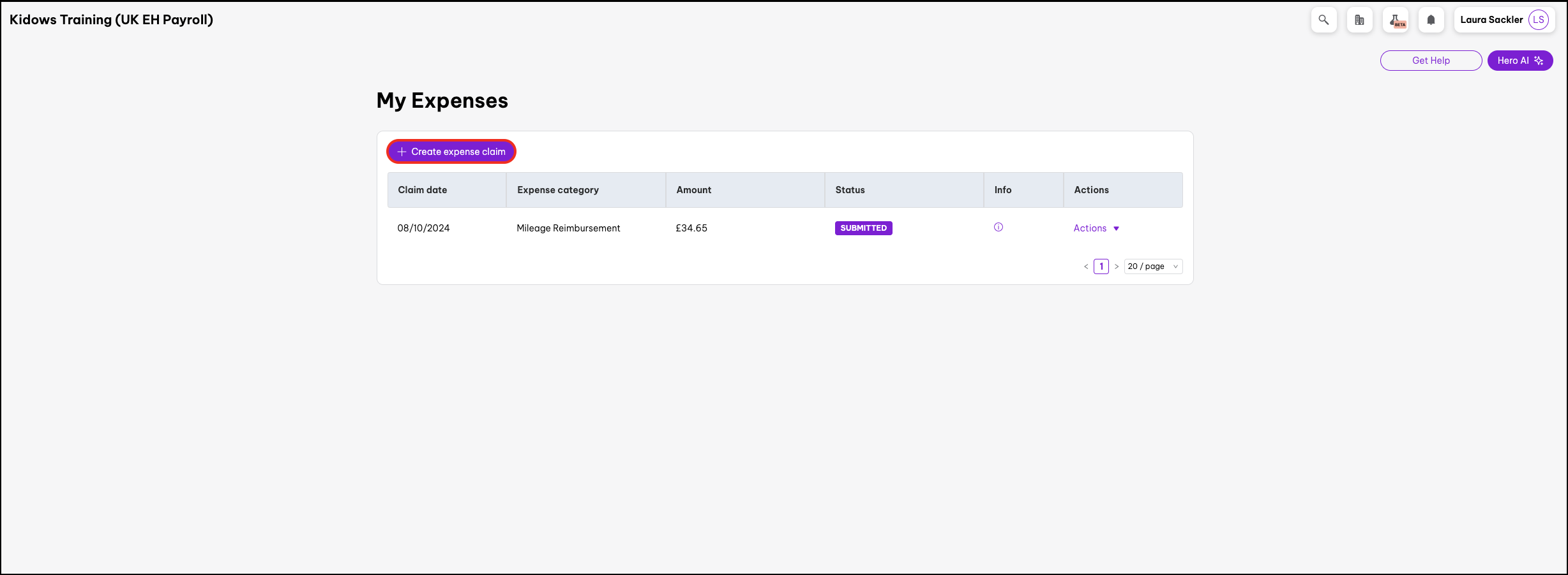 - On the expense claim you wish to manage, click on Actions.