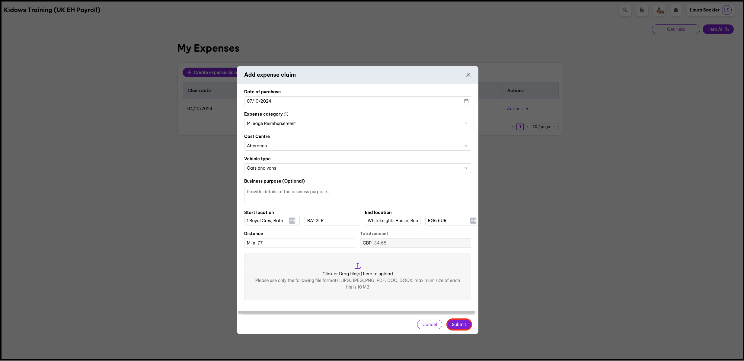 The employee who wishes to submit the mileage reimbursement expense claim must complete this step in Employment Hero.