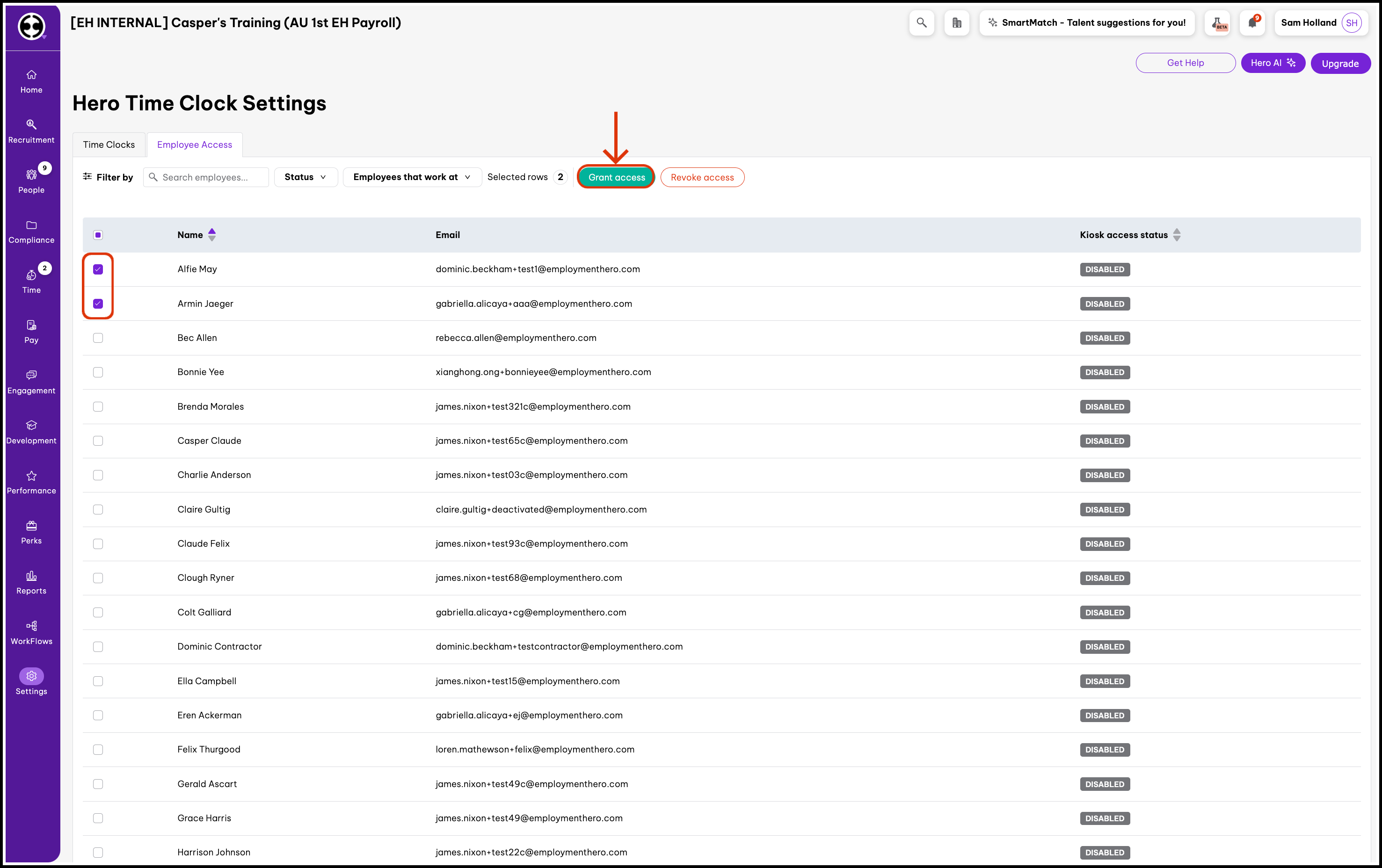 - You will now see a table that lists the names of all employees who can be enrolled on to Hero Time Clock.