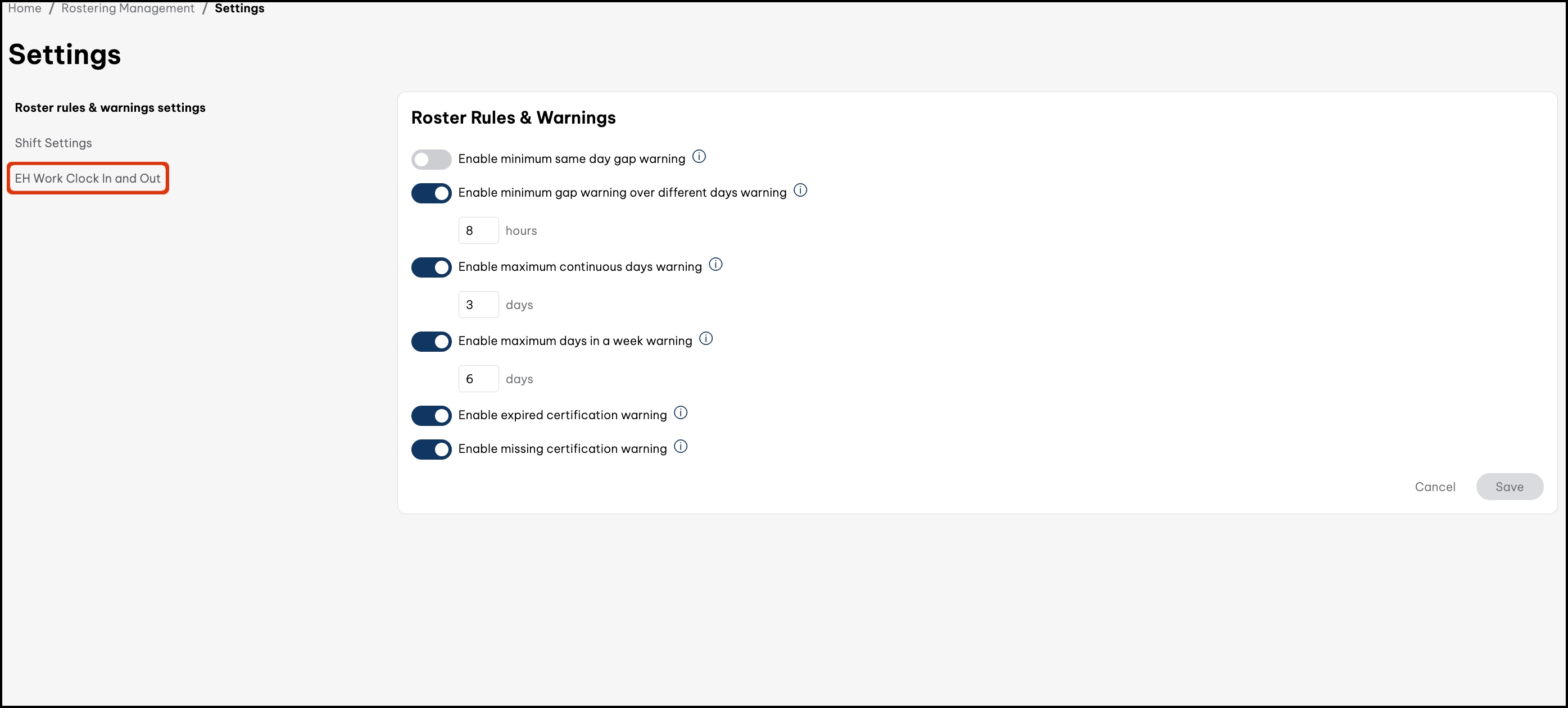 - On the Roster rules & warnings settings page that will now appear, click EH Work Clock In and Out.