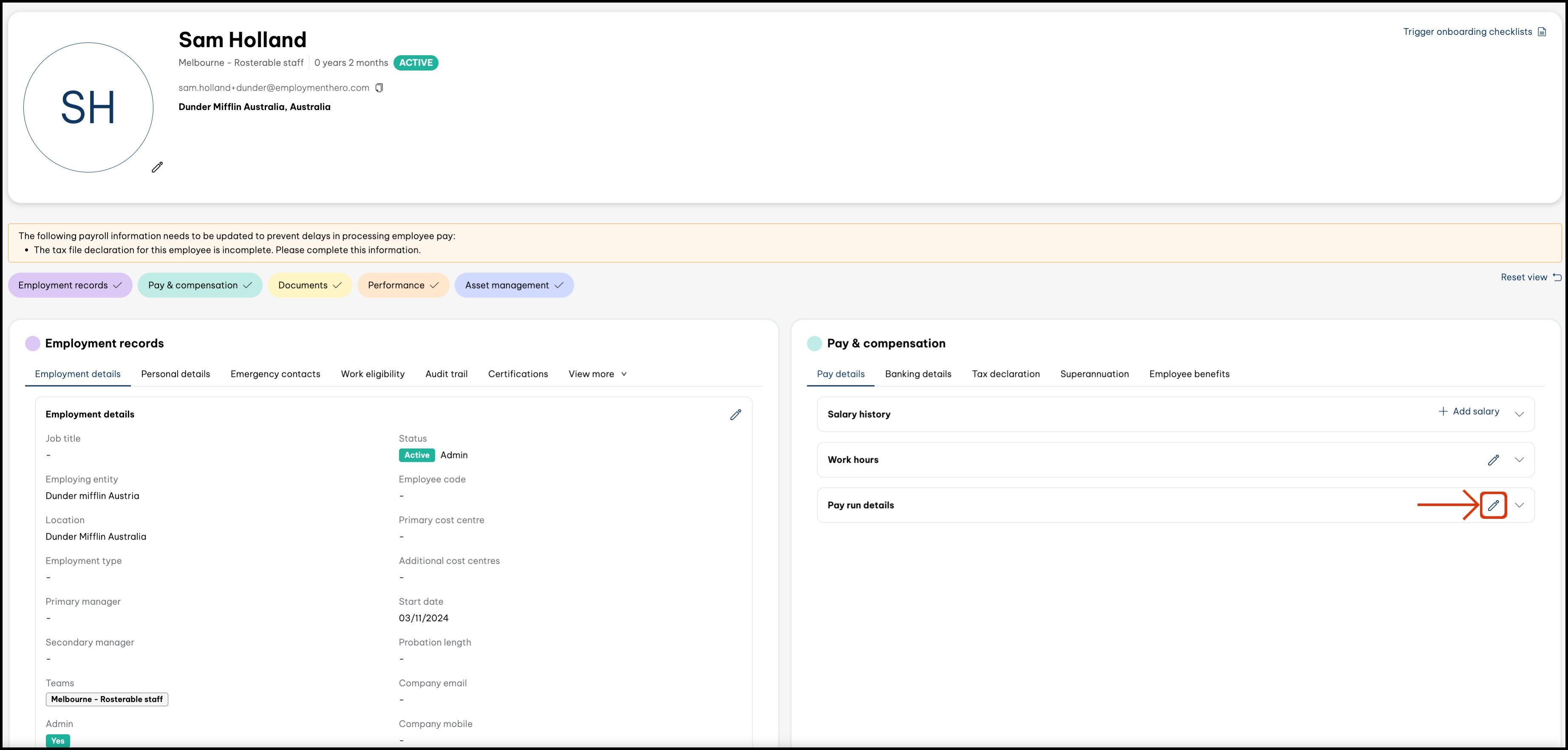 - On the pay run details section, click the edit button (pencil icon).