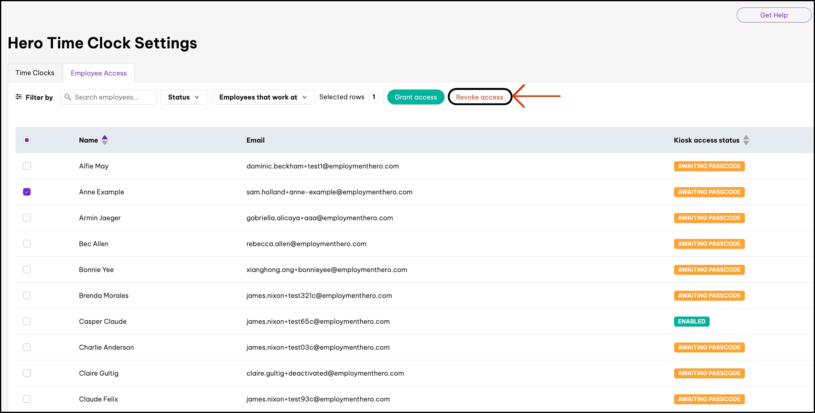 - Under the Kiosk access status column, the employee(s) who have been granted access will now go from the Disabled status to the Awaiting passcode status.