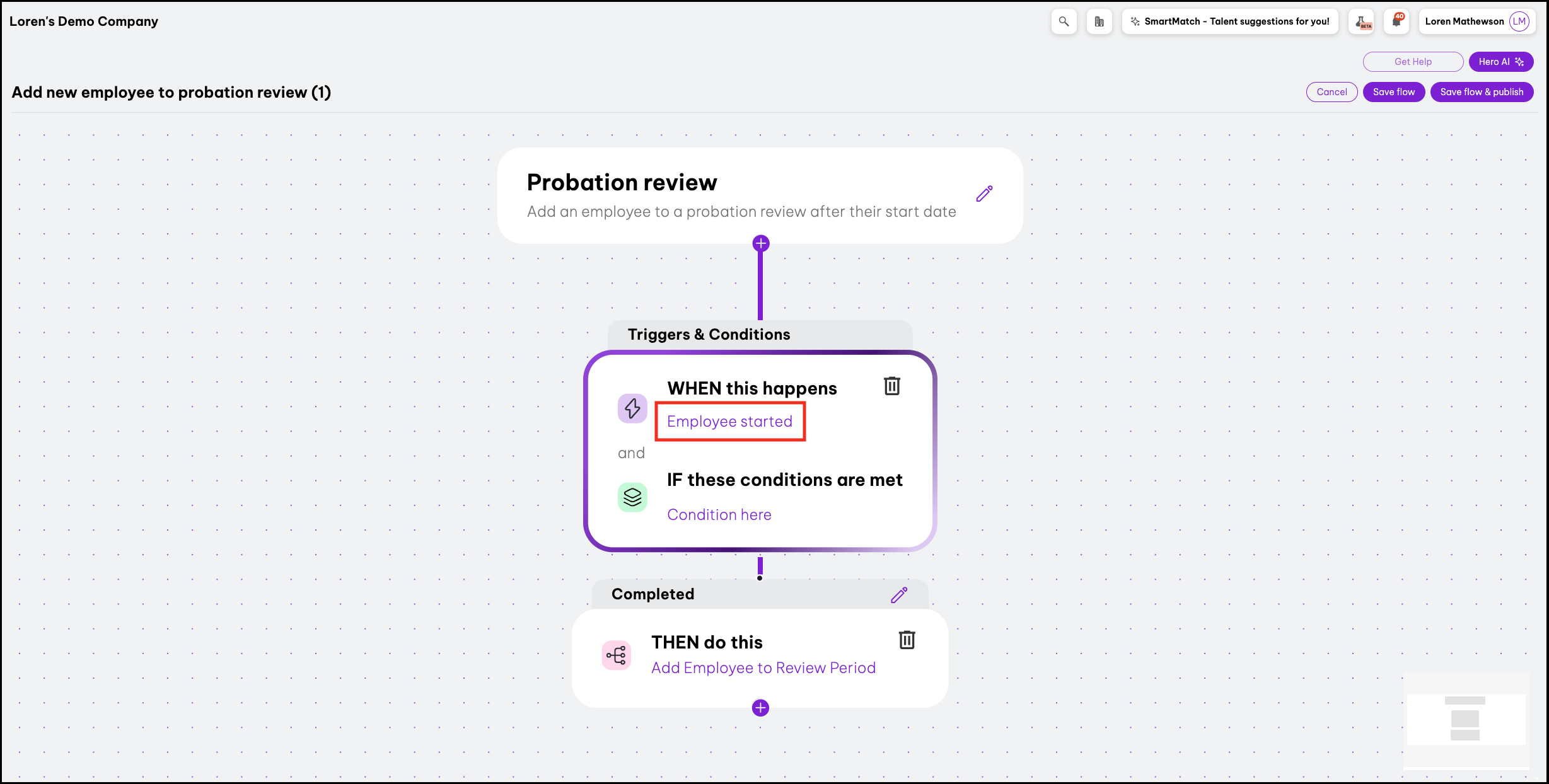 - Under Triggers and Conditions, click on Employee started to add your trigger event.