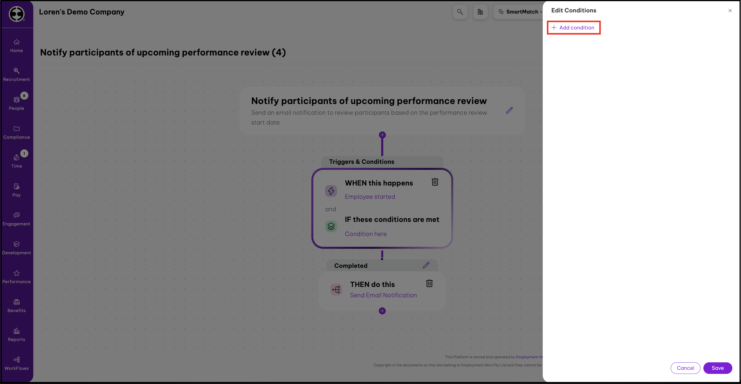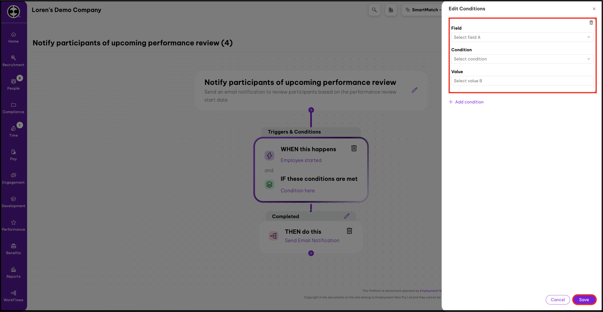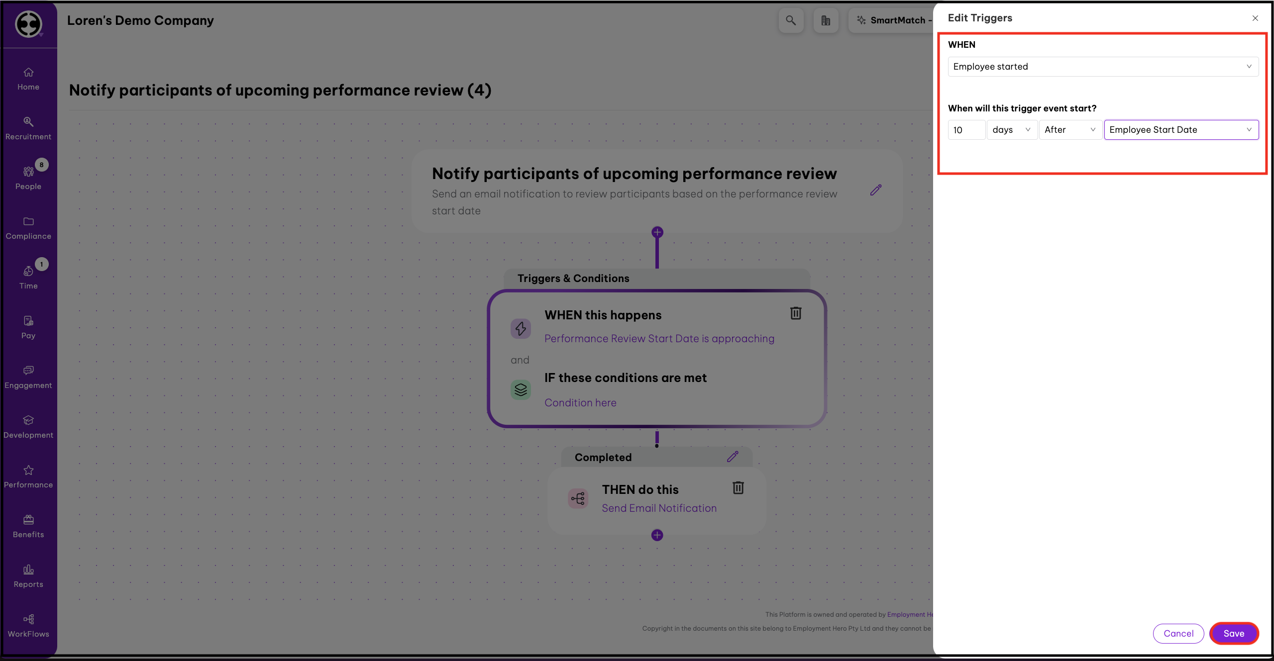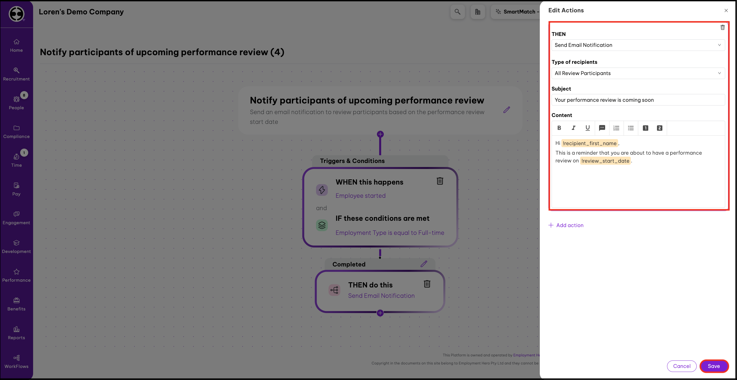 This workflow enables you to automate key aspects of the probation and performance review processes. You can schedule an email reminder before a performance review begins, notifying people of the upcoming review. You can choose how many days or weeks in advance the email should be sent and specify the performance review in the Conditions step.