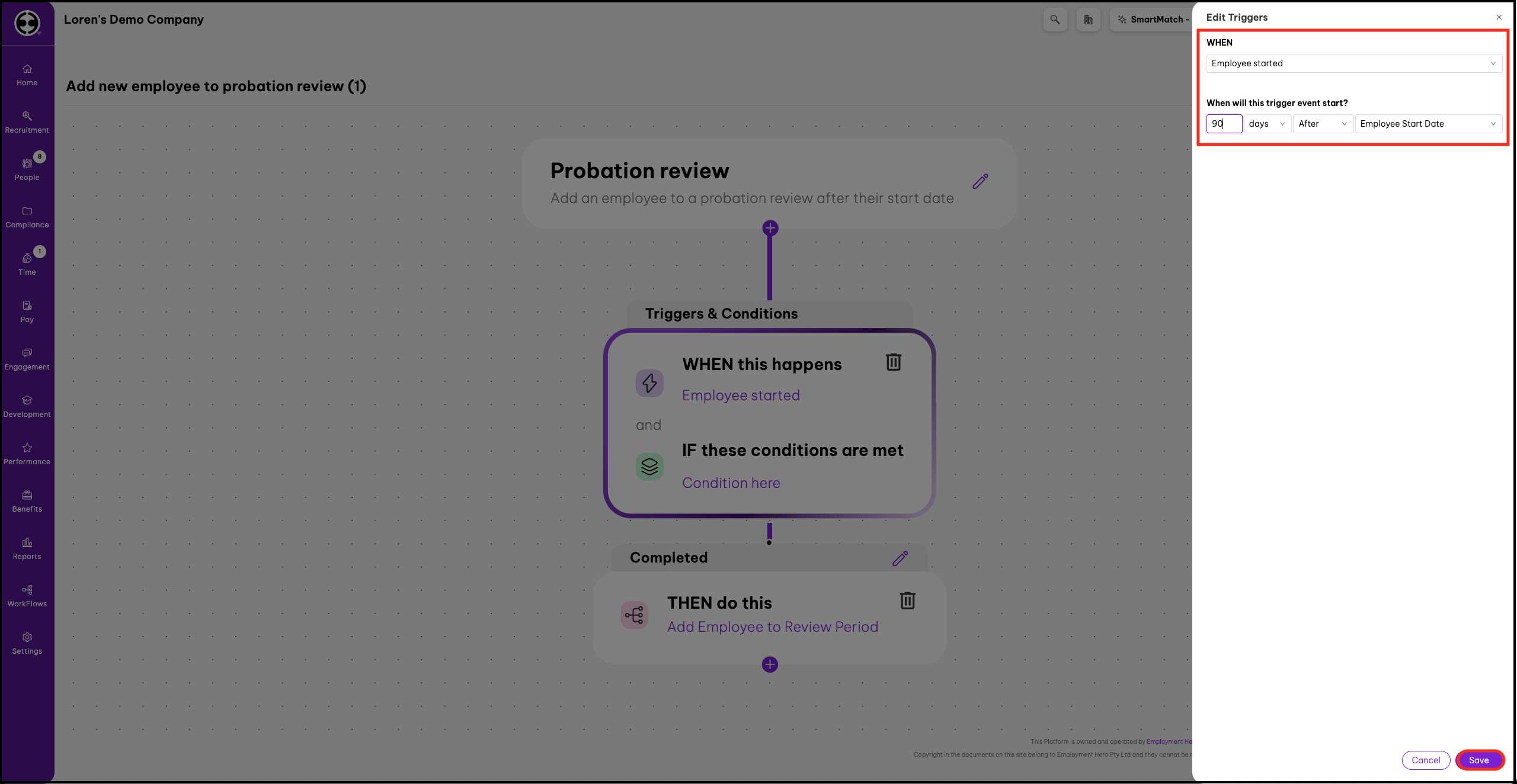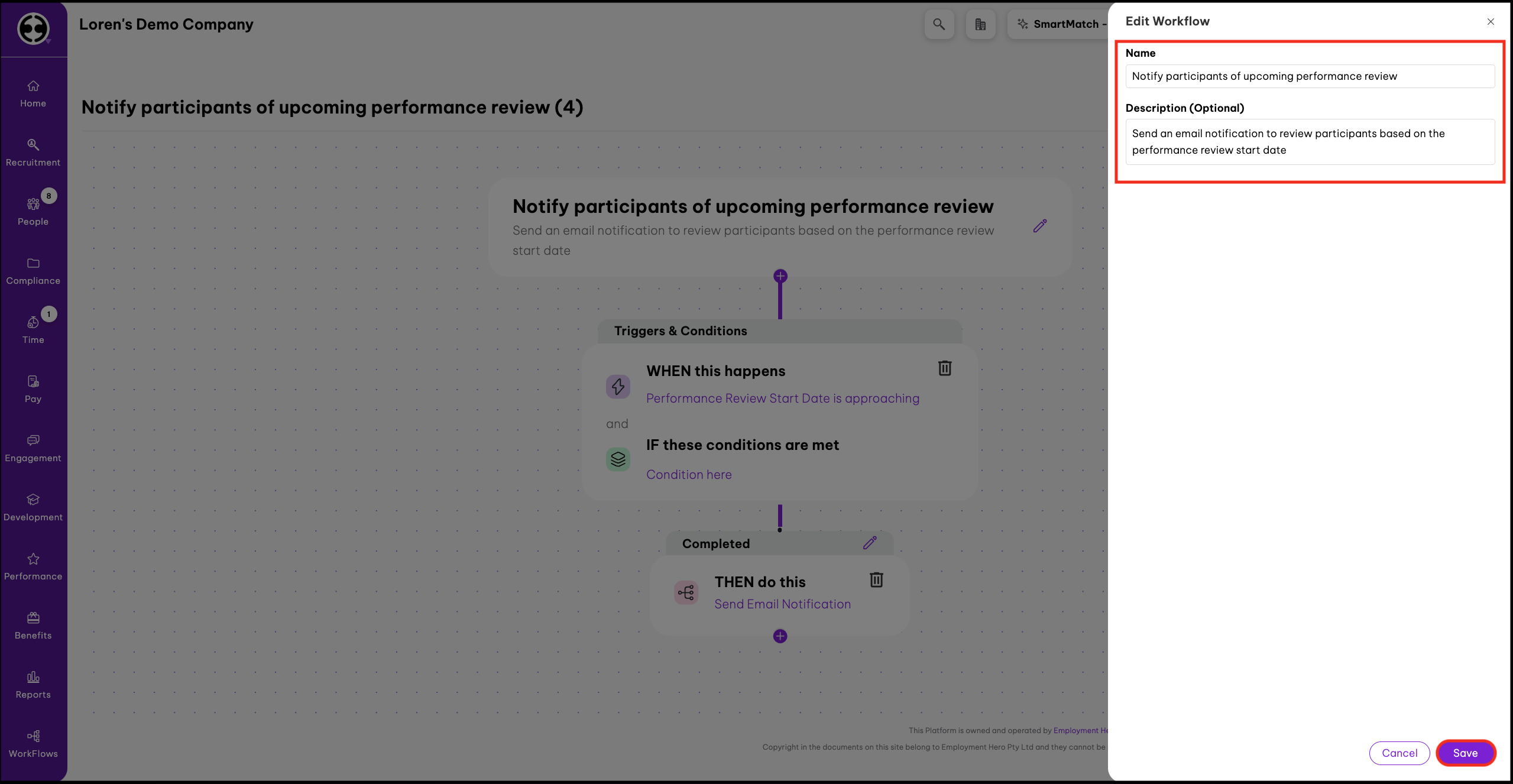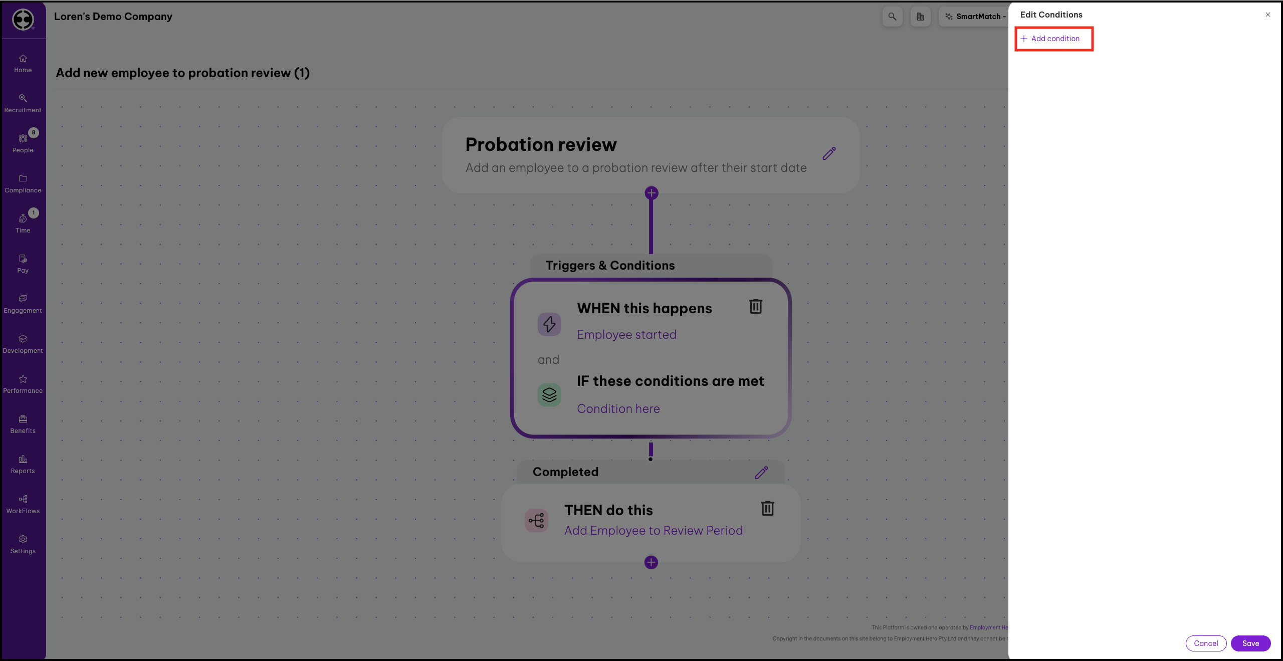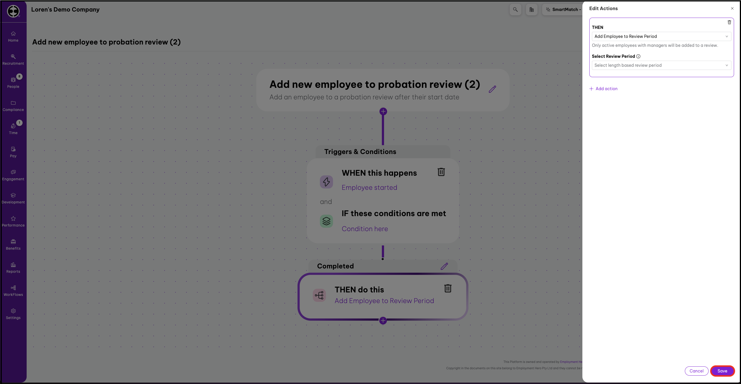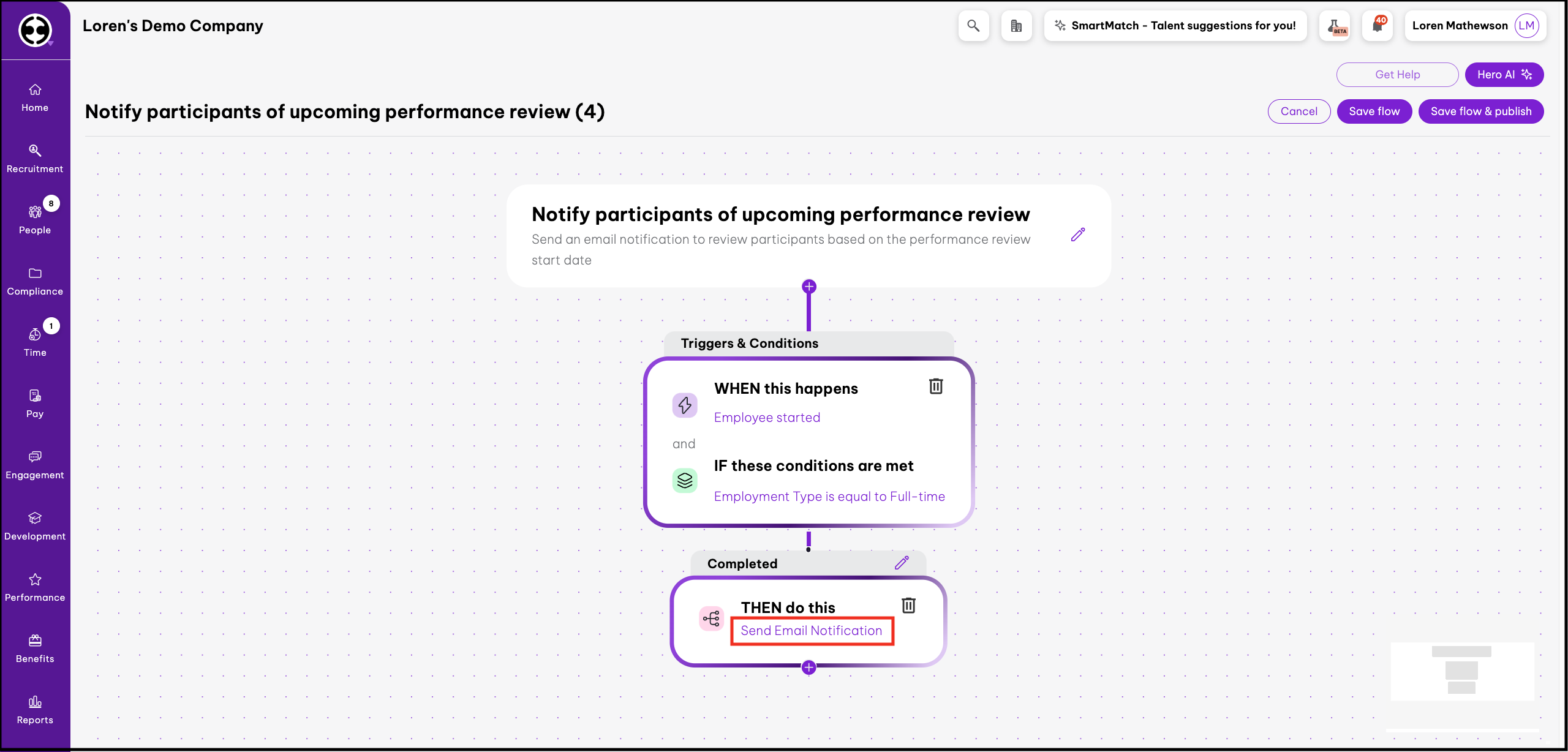 This workflow enables you to automate key aspects of the probation and performance review processes. You can schedule an email reminder before a performance review begins, notifying people of the upcoming review. You can choose how many days or weeks in advance the email should be sent and specify the performance review in the Conditions step.