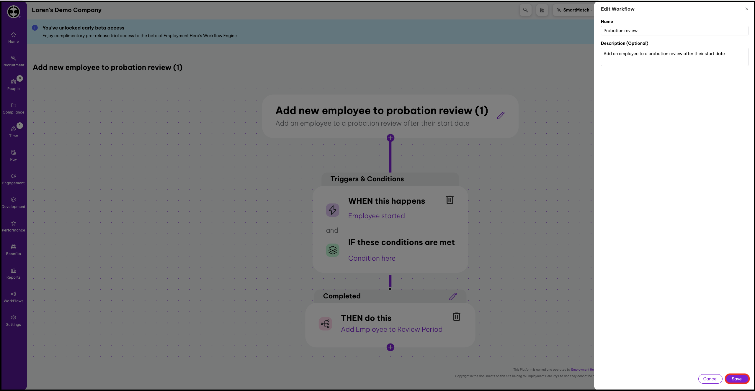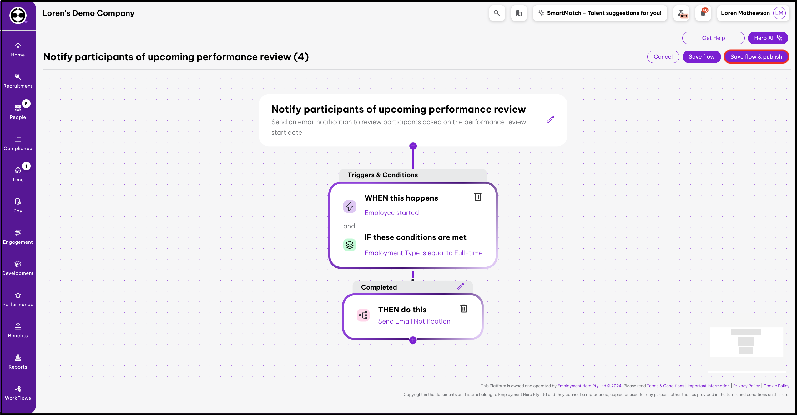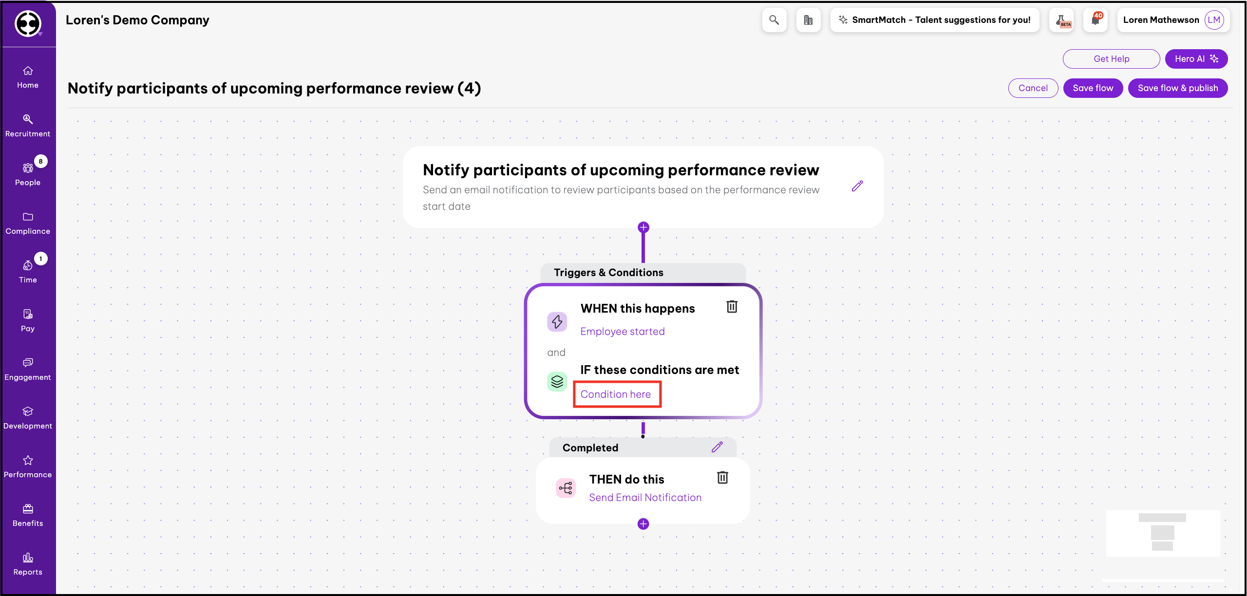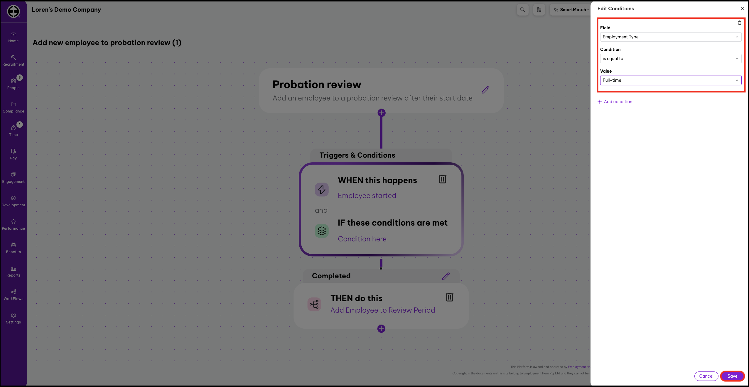 This workflow enables you to automate key aspects of the probation and performance review processes. You can schedule an email reminder before a performance review begins, notifying people of the upcoming review. You can choose how many days or weeks in advance the email should be sent and specify the performance review in the Conditions step.