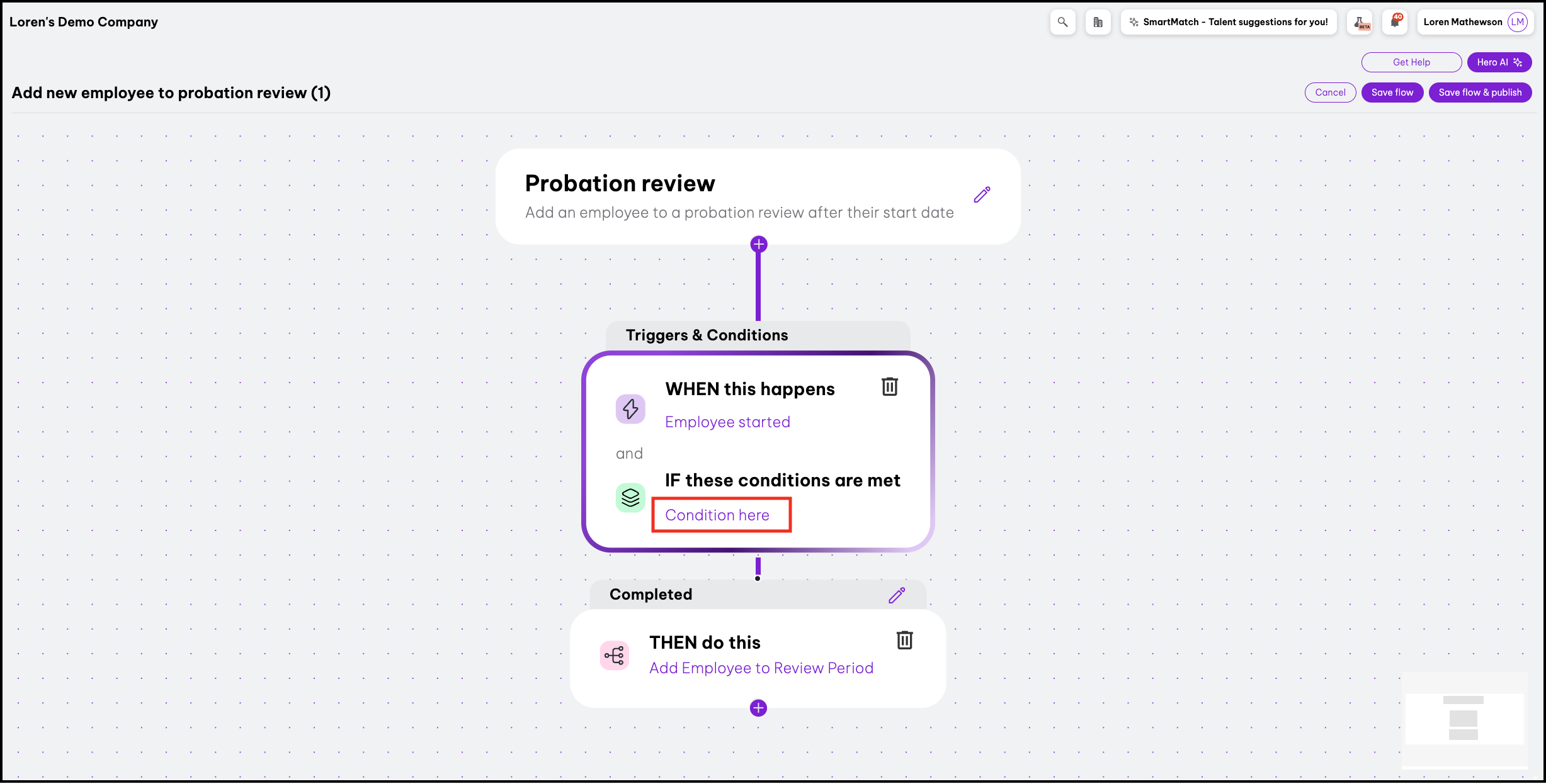 - Next, you need to set when the action will happen. Click on Employee review end date is approaching.