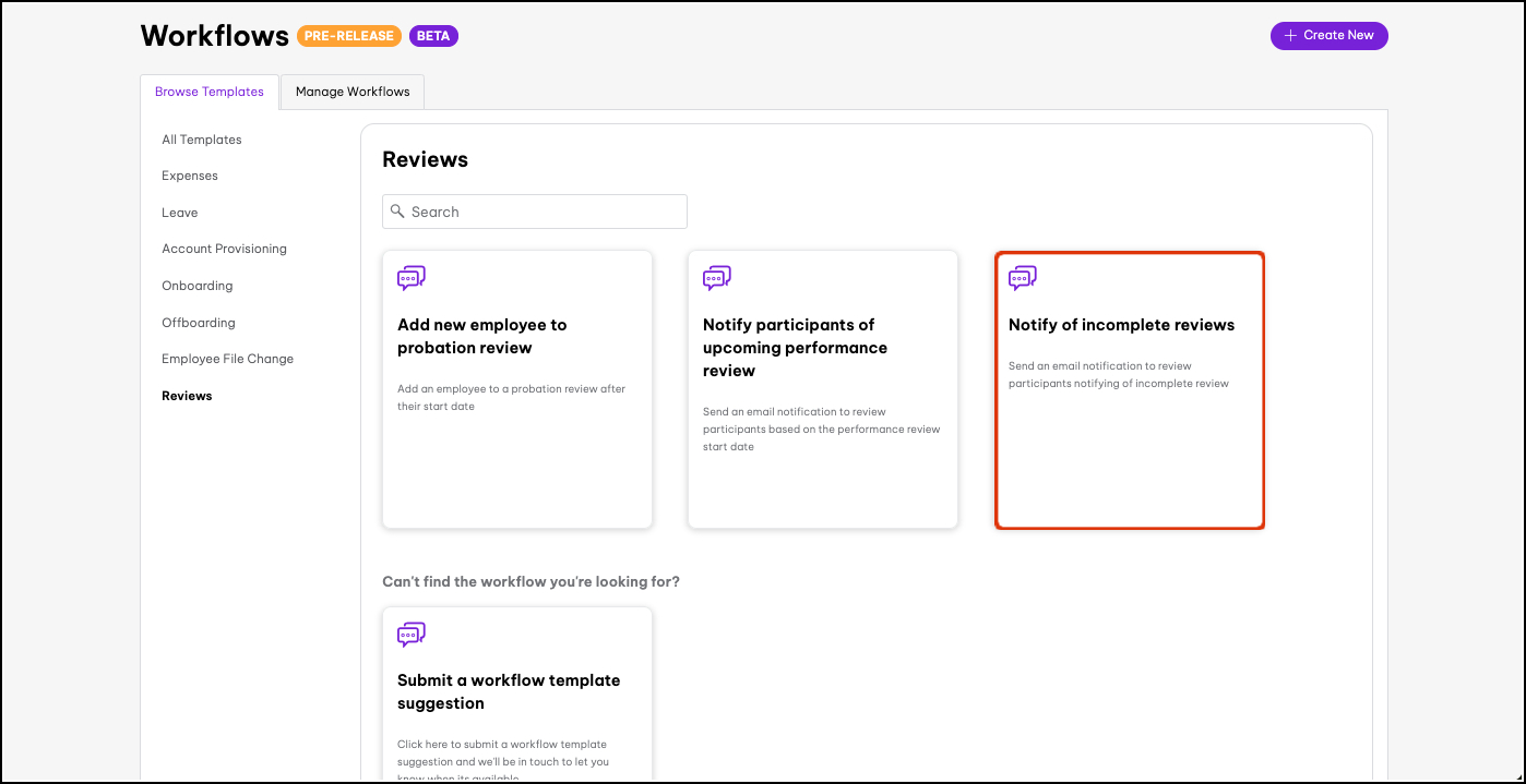 Please note that the "Notify users of incomplete reviews" workflow does not work for probation reviews. It is only applicable to performance reviews with start and end dates.
