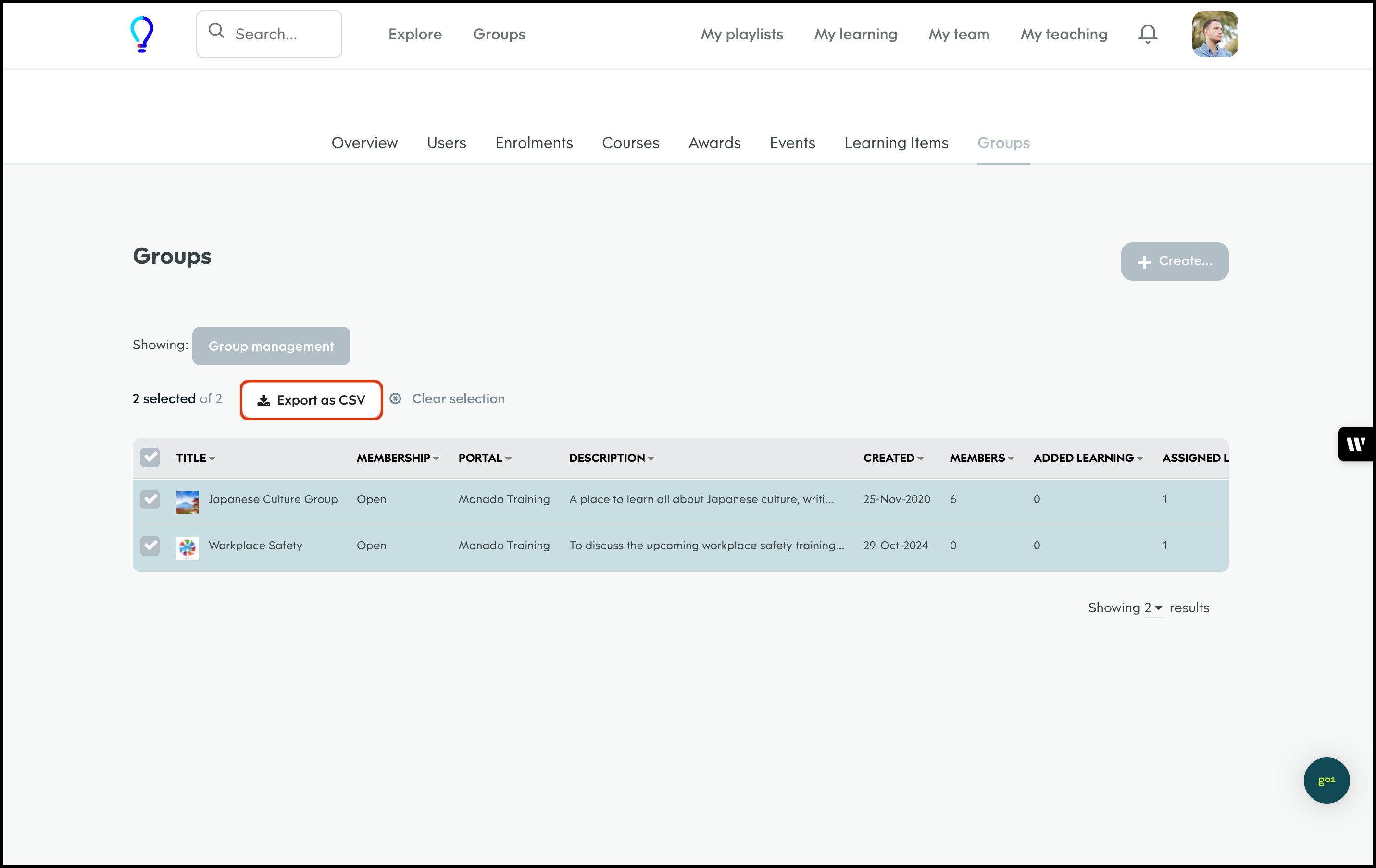 The Group Management feature allows you to create your organisation's learning groups a user can join to discuss certain topics or training needs.. You can also use this feature to setup the membership details, edit the information, and setup the visibility of the group. Lastly, you can also use this feature to delete a group you no longer need or export the list of groups on your learning platform.