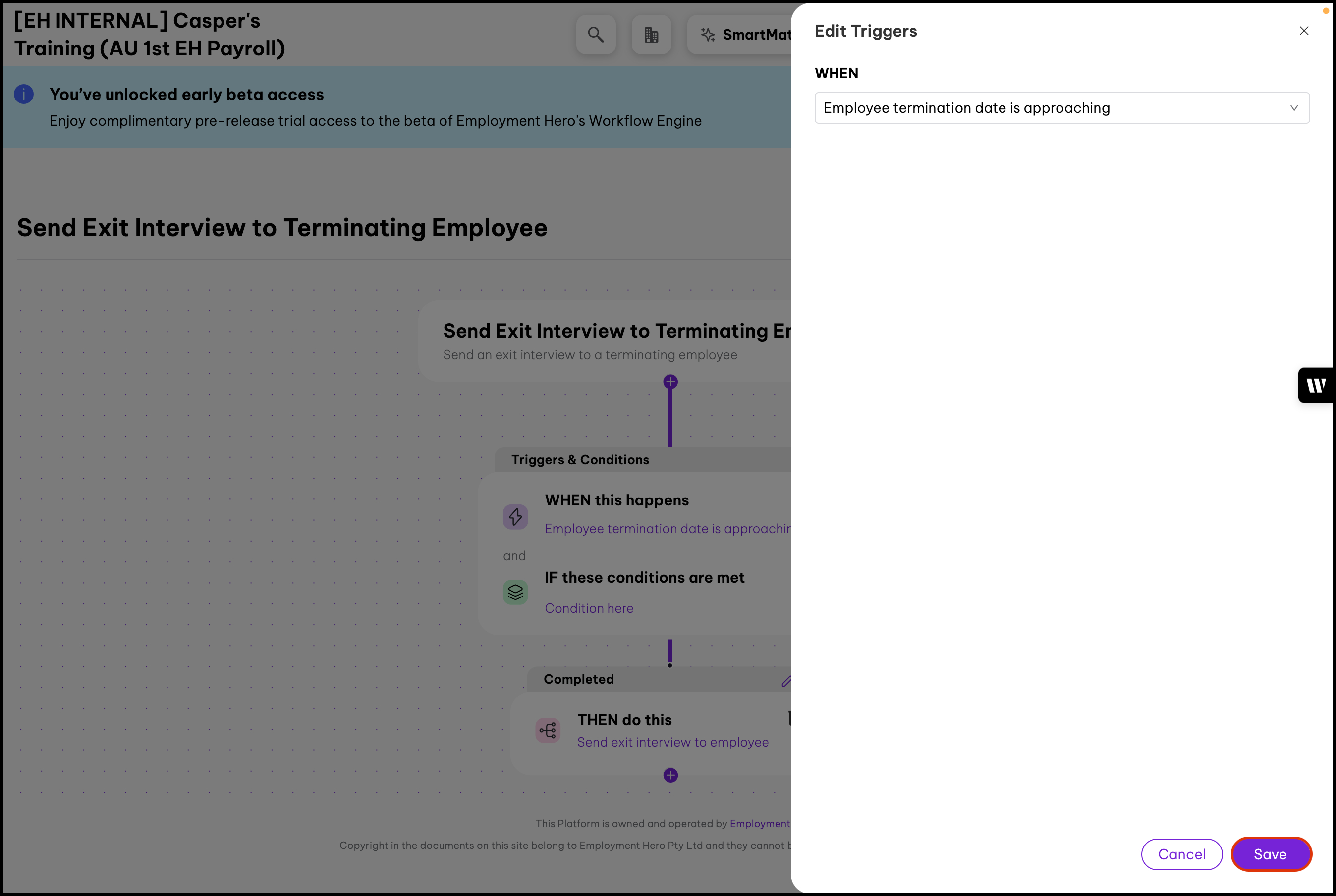 The Offboarding Workflows feature lets admins create workflows to automate the sending of an exit survey when you offboard an employee from your platform. This feature follows a "when-if-then" sequence for every step of the workflow. To learn more about this and see examples, please refer to The When-If-Then sequence and scenarios tab in the Further information section of this article.