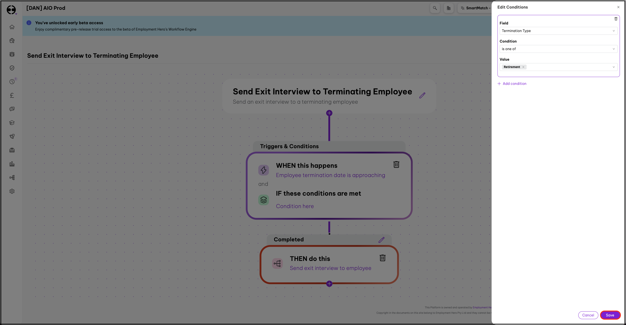 If you would like to set up different workflows according to termination type (e.g. If you would like to set up a company-wide email in the event of a retirement, or if you would like to automatically set up an exit interview for a resignation), follow the process below.