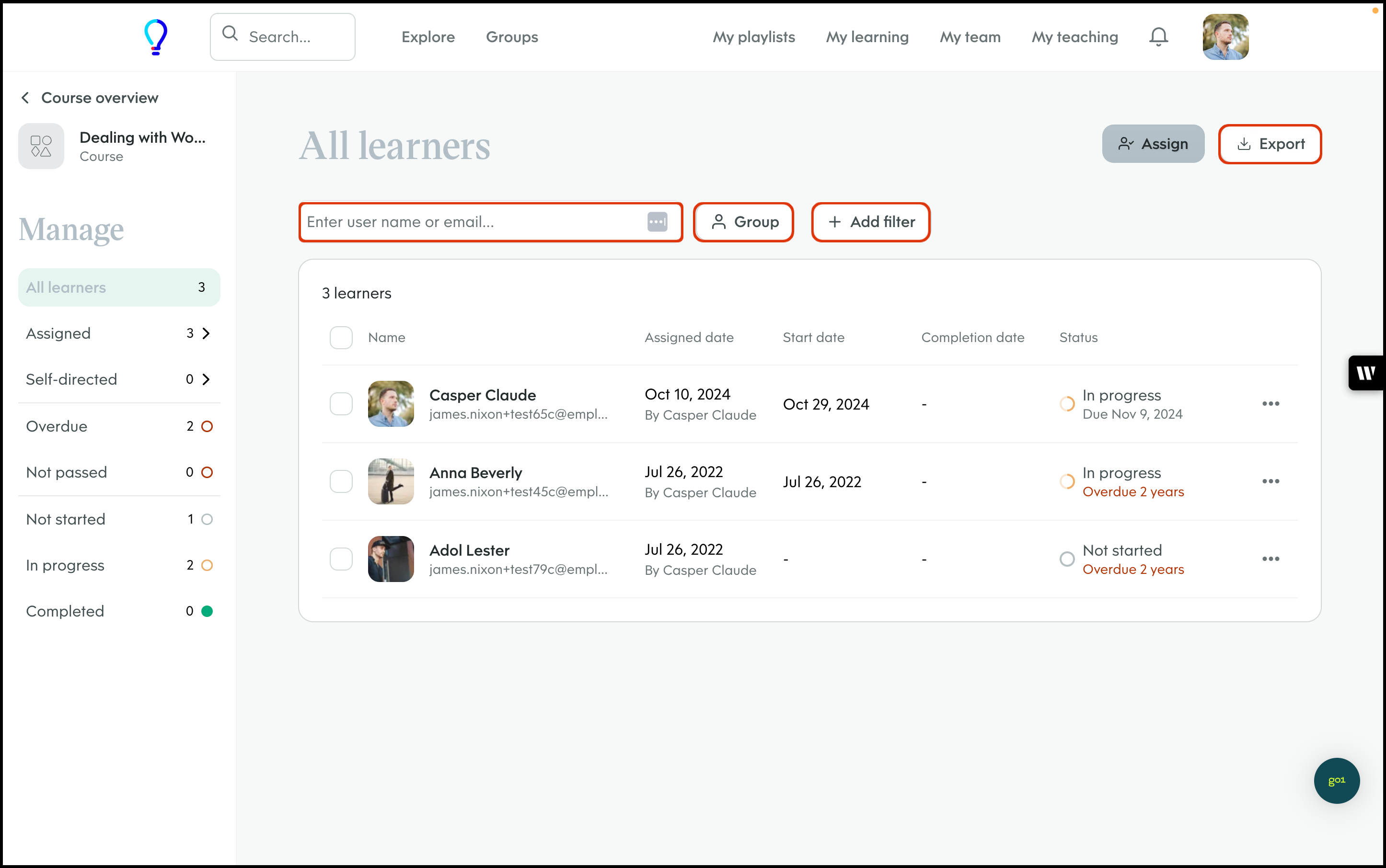 Filters are also available to find learners assigned this content within a timeframe. Those that began learning the course or resource within a particular date range, and within the Assigned sections, the due date period. All filters, including the Group filter will persist while you navigate around the Manage page against every learning resource.