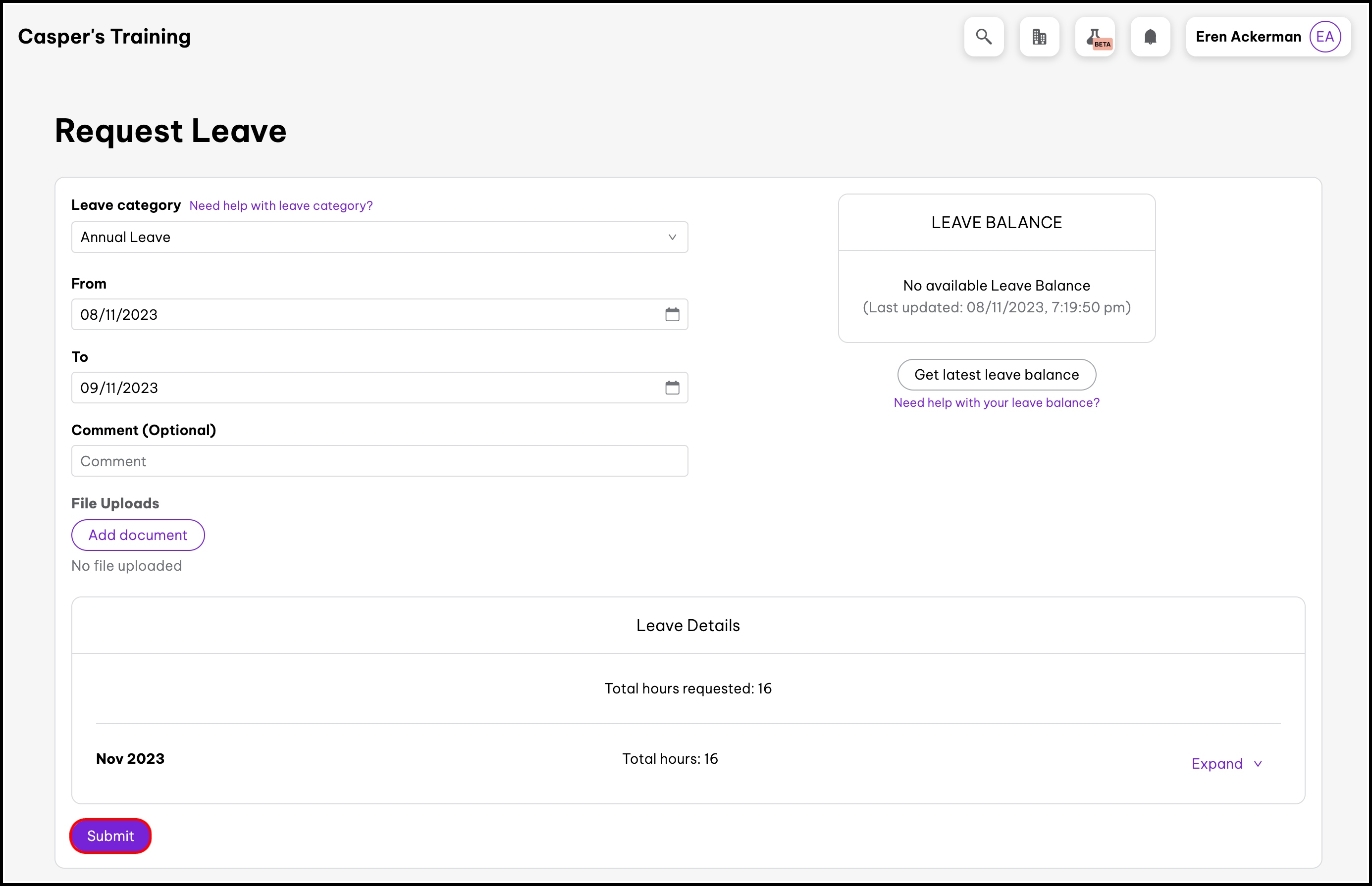 - (Optional) Click the Add document button and attach one or more files. (Make sure you only have one window logged into Employment Hero as this helps ensure the upload works correctly.)