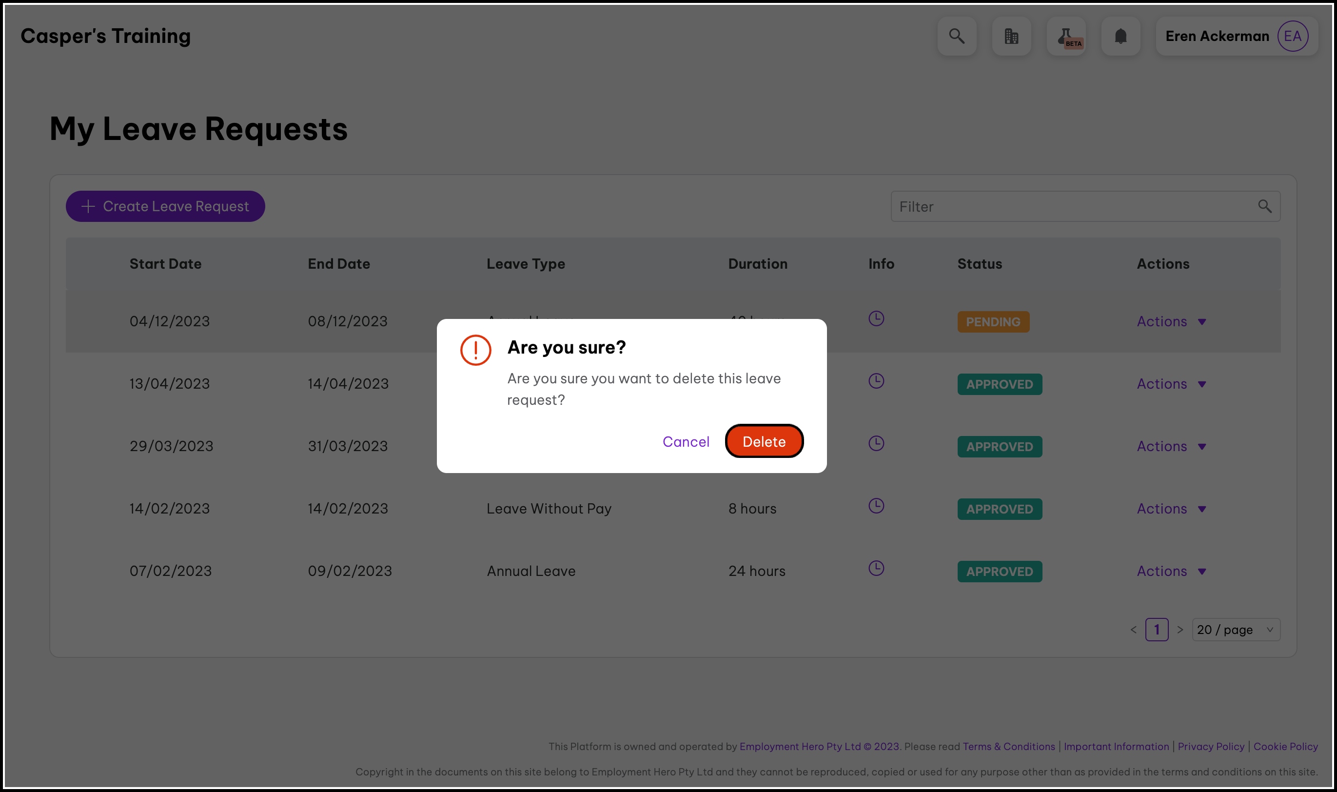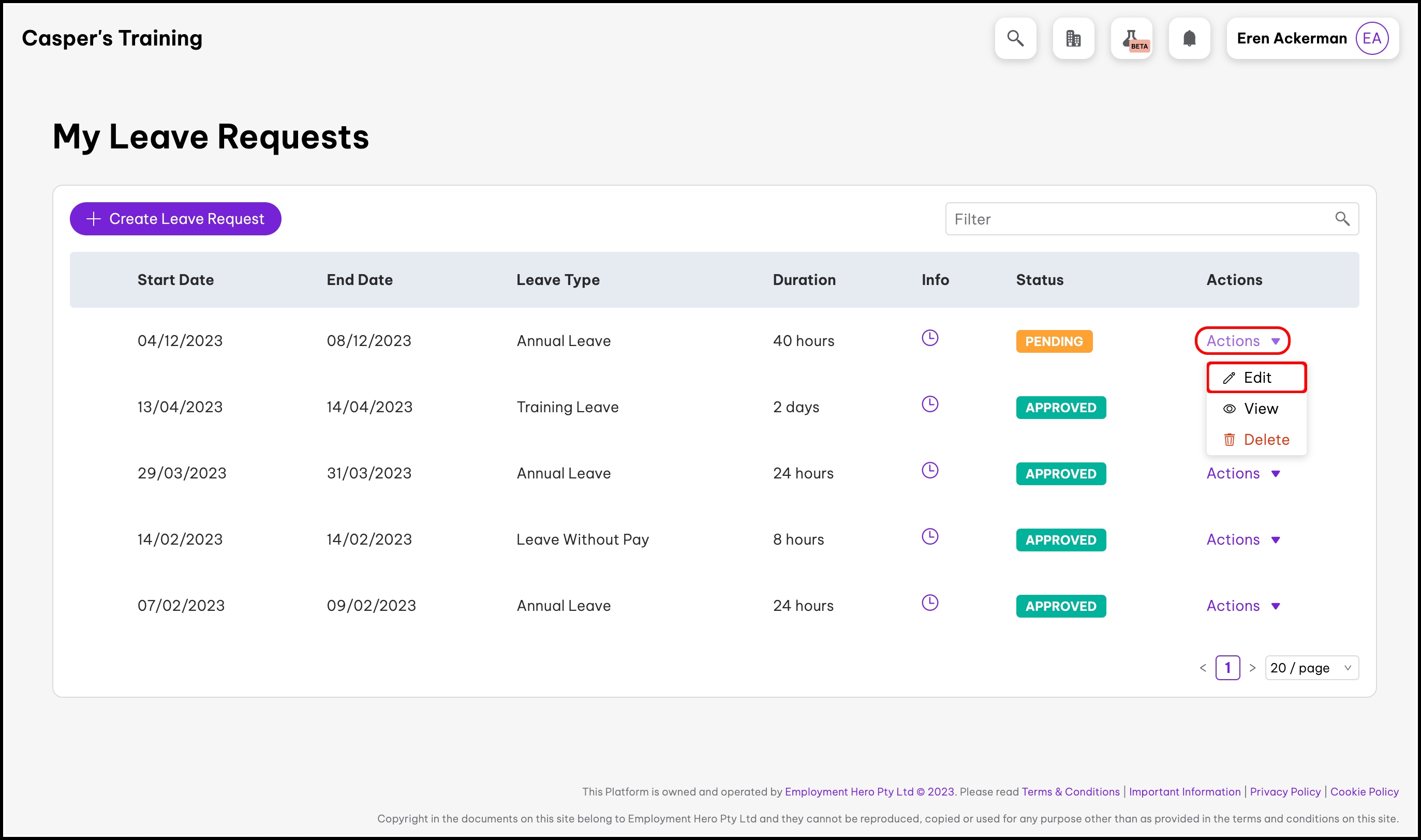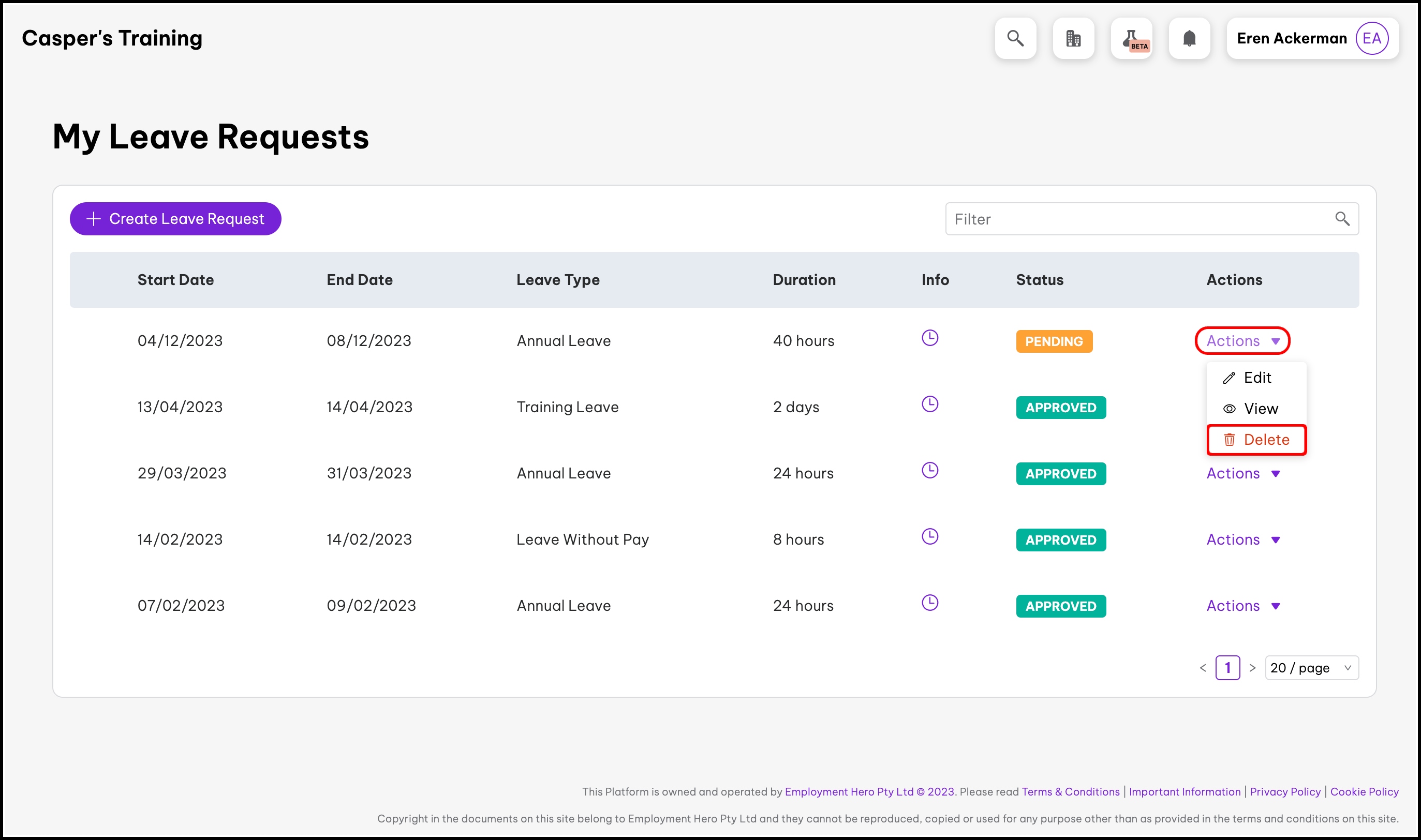 This article assumes you as an employee or contractor can access the Actions button on your My Leave Requests page. If the Actions button is not visible, you can neither edit nor delete your leave request and should contact your employer for assistance and/or approval. Employer approval is especially important if your leave has already been processed in a pay period.
