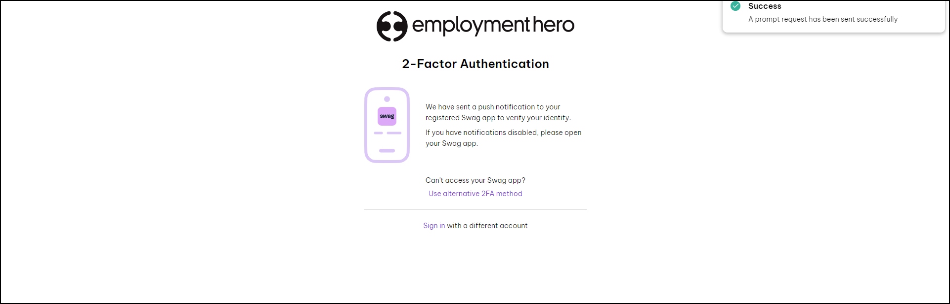 - After successfully logging in, you will receive a message regarding a push notification being sent to your Employment Hero Work app.
