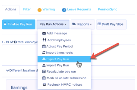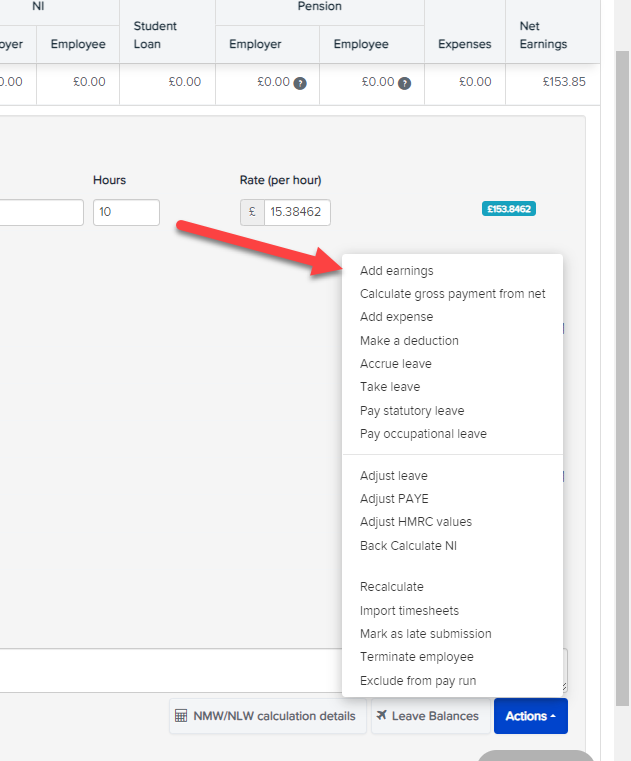 Once you've done this you can then go into the employees details within the pay run. Then go to Actions Add Earnings Line:
