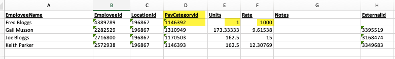 3. Open the spreadsheet and identify the employee with the bonus, this will then let you see the pay category ID you need to use. You should then copy the bonus Pay Category ID and paste it into that column for anyone you want to pay the bonus to.