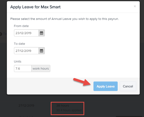 If an employee has put in a leave request for say 38 hours, but they only took 30.4 hours, you have 2 options:- When you apply the leave from the leave request tab you can select to enter only 30.4 hours. However, the system will still be waiting for the other 7.6 hours to be applied, and as such the leave request will keep coming into each pay run. You can get rid of this prompt by selecting the ‘mark as manually applied’ option.