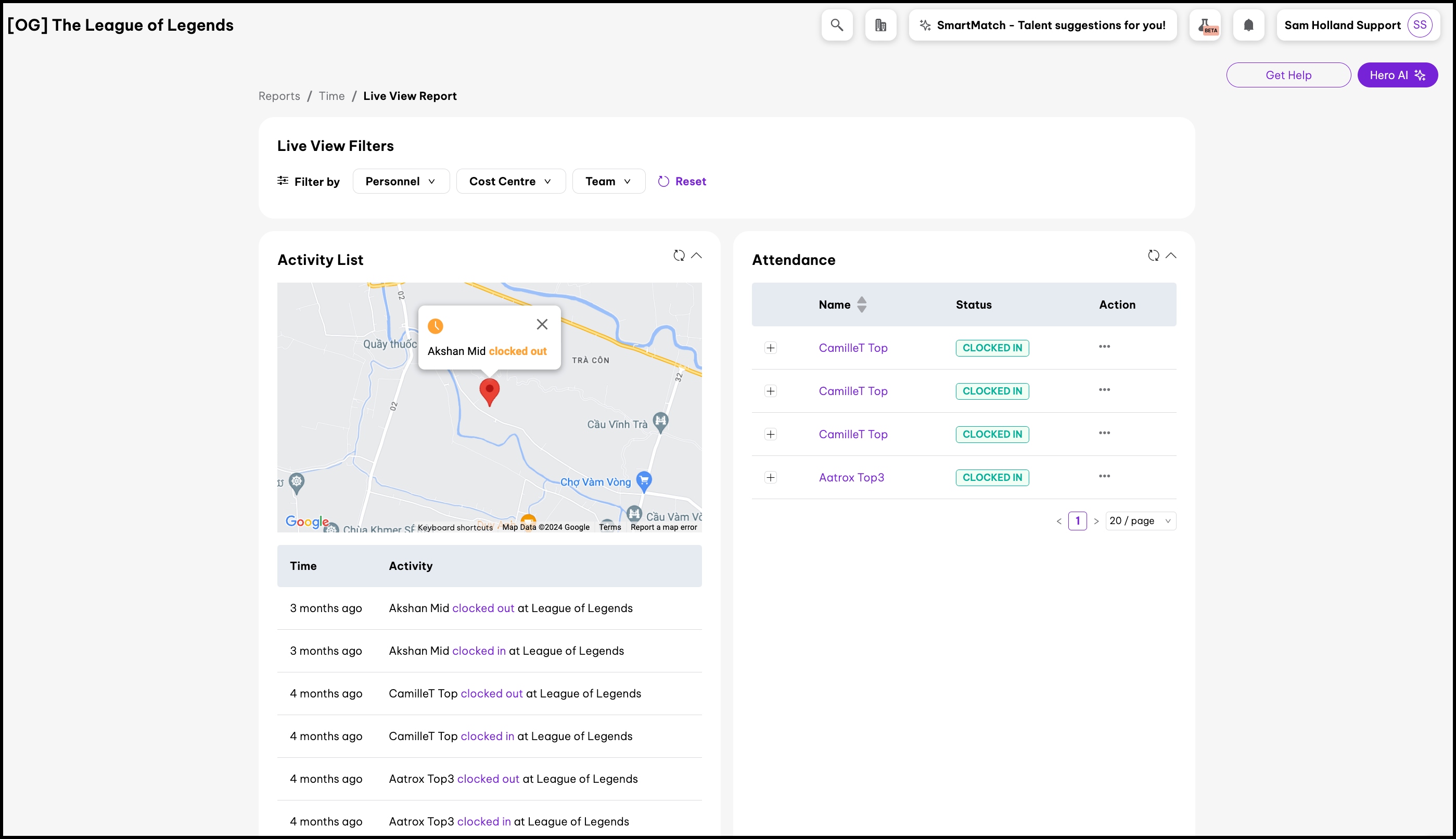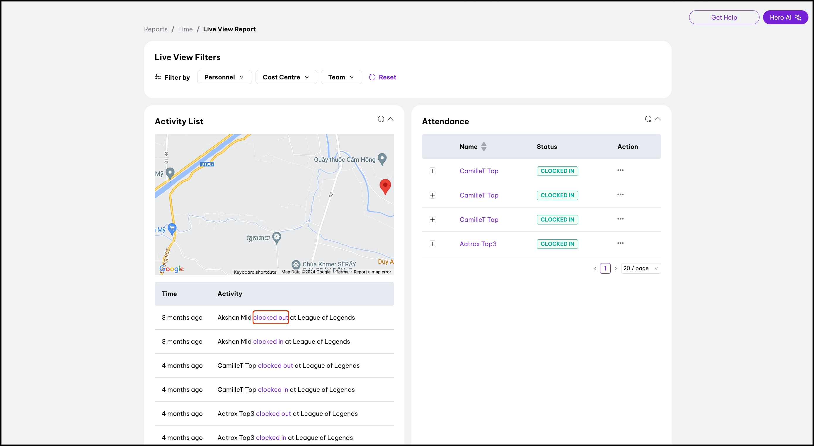 The Live View Report feature provides an Activity List and Attendance page, displaying a Google Maps view of employees' clock-in/out locations and their current status (e.g. 'Clocked In'). Admins can also use Live View Filters to make the report show specific personnel, cost centre, and team data.