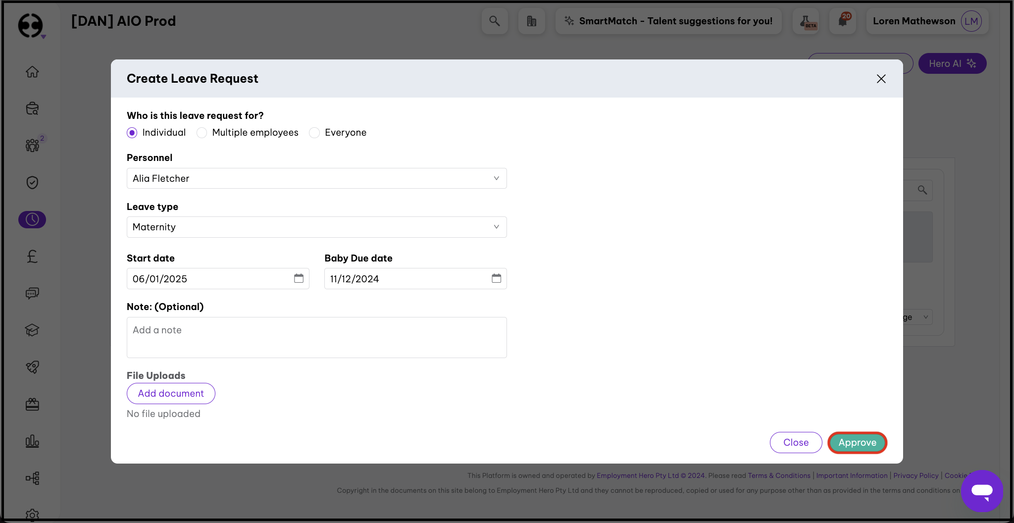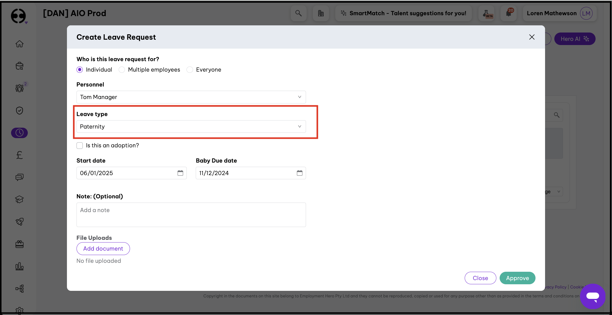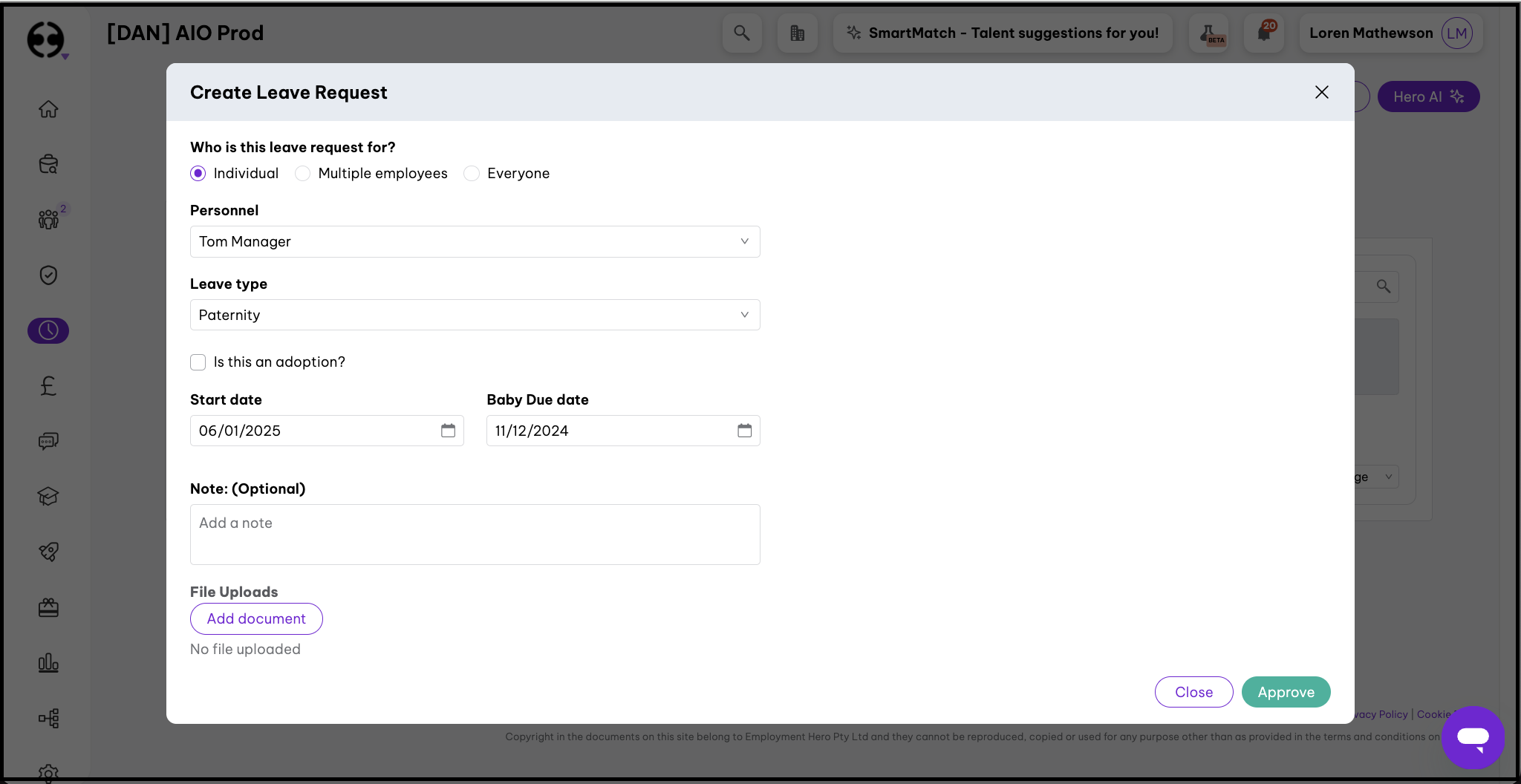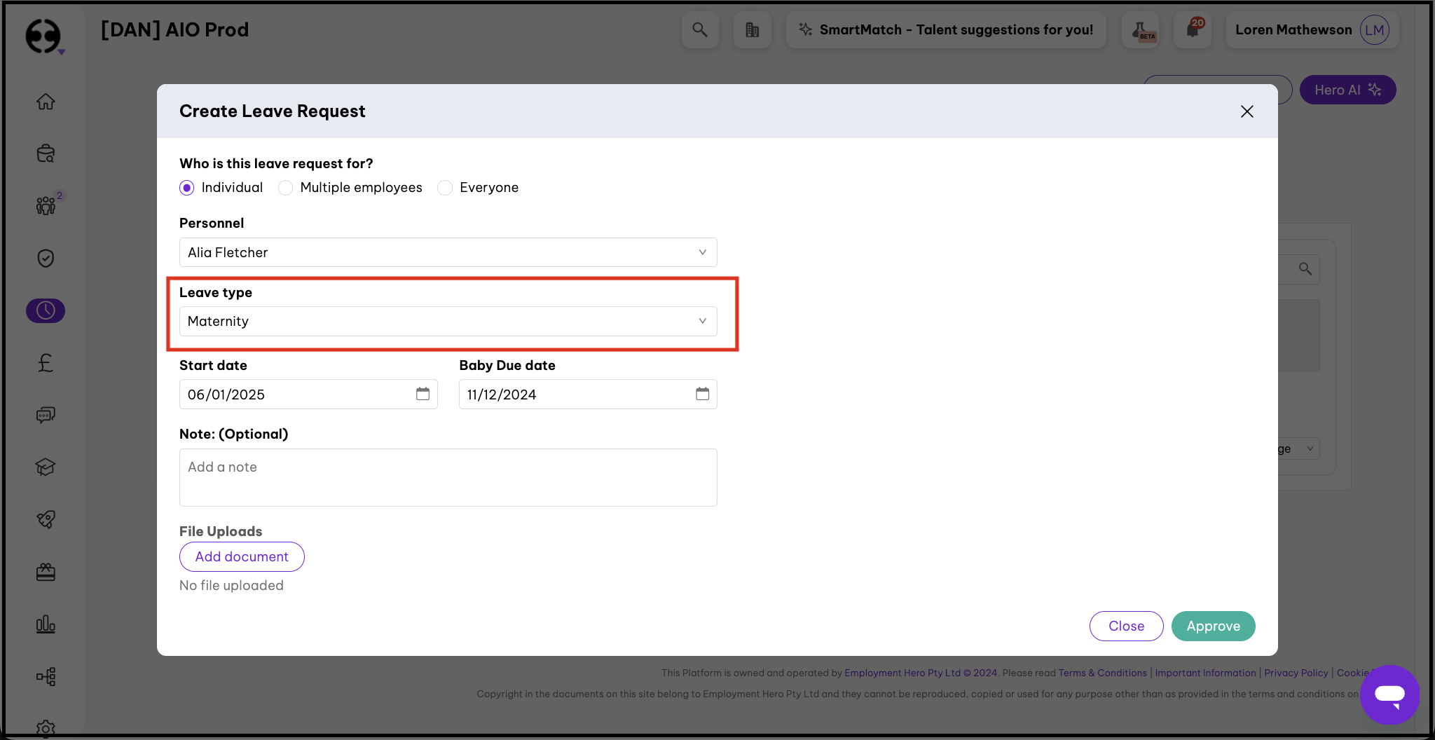 To streamline this process, Employment Hero automatically provides statutory leave types, aligning requests with payroll requirements. Employees can submit requests through a dedicated form, ensuring compliance with relevant regulations and reducing manual administrative work for HR teams. This helps businesses manage employee leave efficiently while ensuring accurate payroll processing.