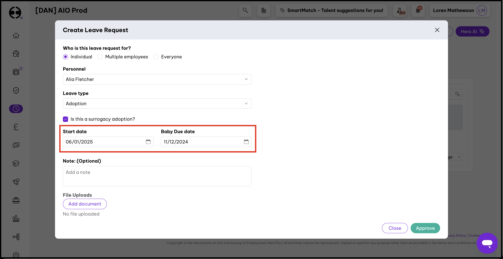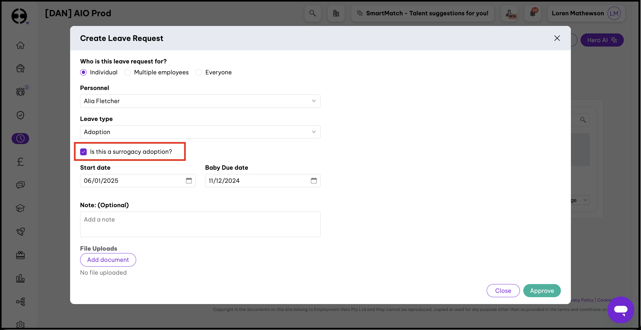 - In the Is this a surrogacy adoption? field, tick the check box if a surrogacy adoption applies. (When this is ticked, the field beside Start date will say Baby Due date rather than Matching Date.)