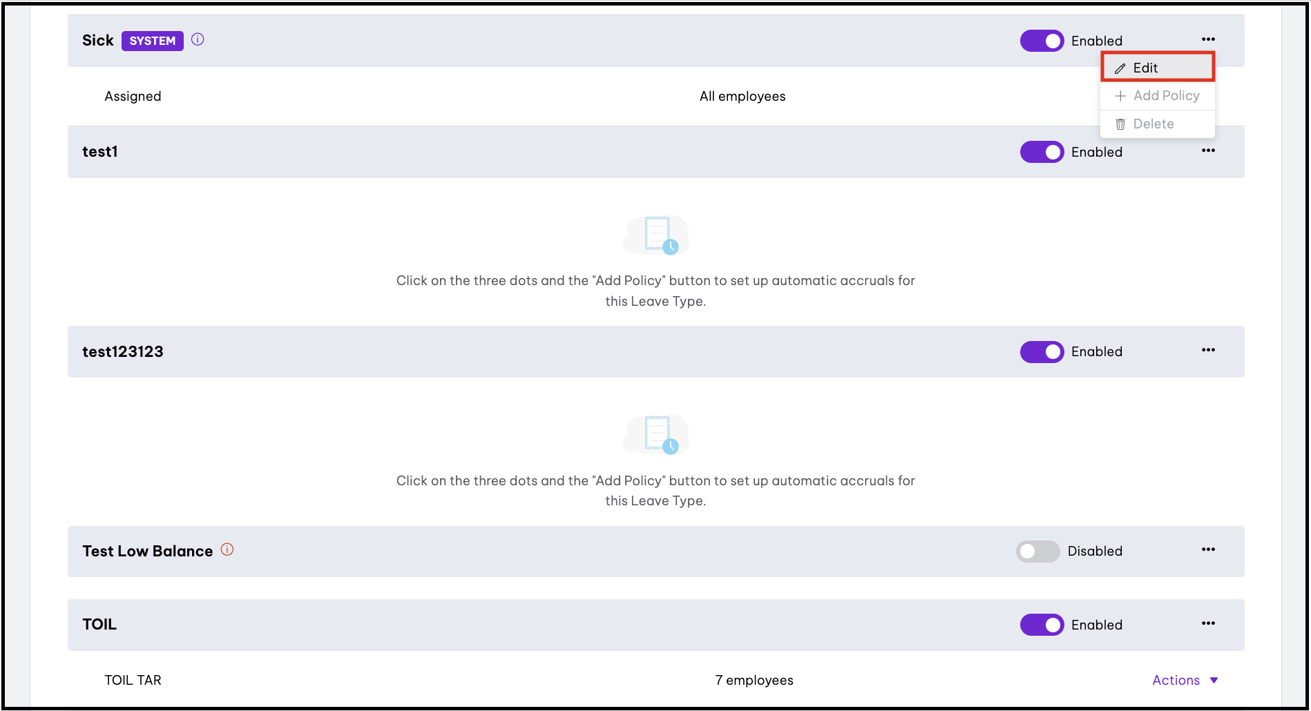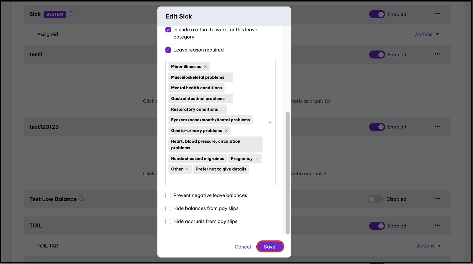 The statutory leave types will automatically appear in your leave categories Employment Hero account. The statutory leave types will appear with a purple System tag next to them.