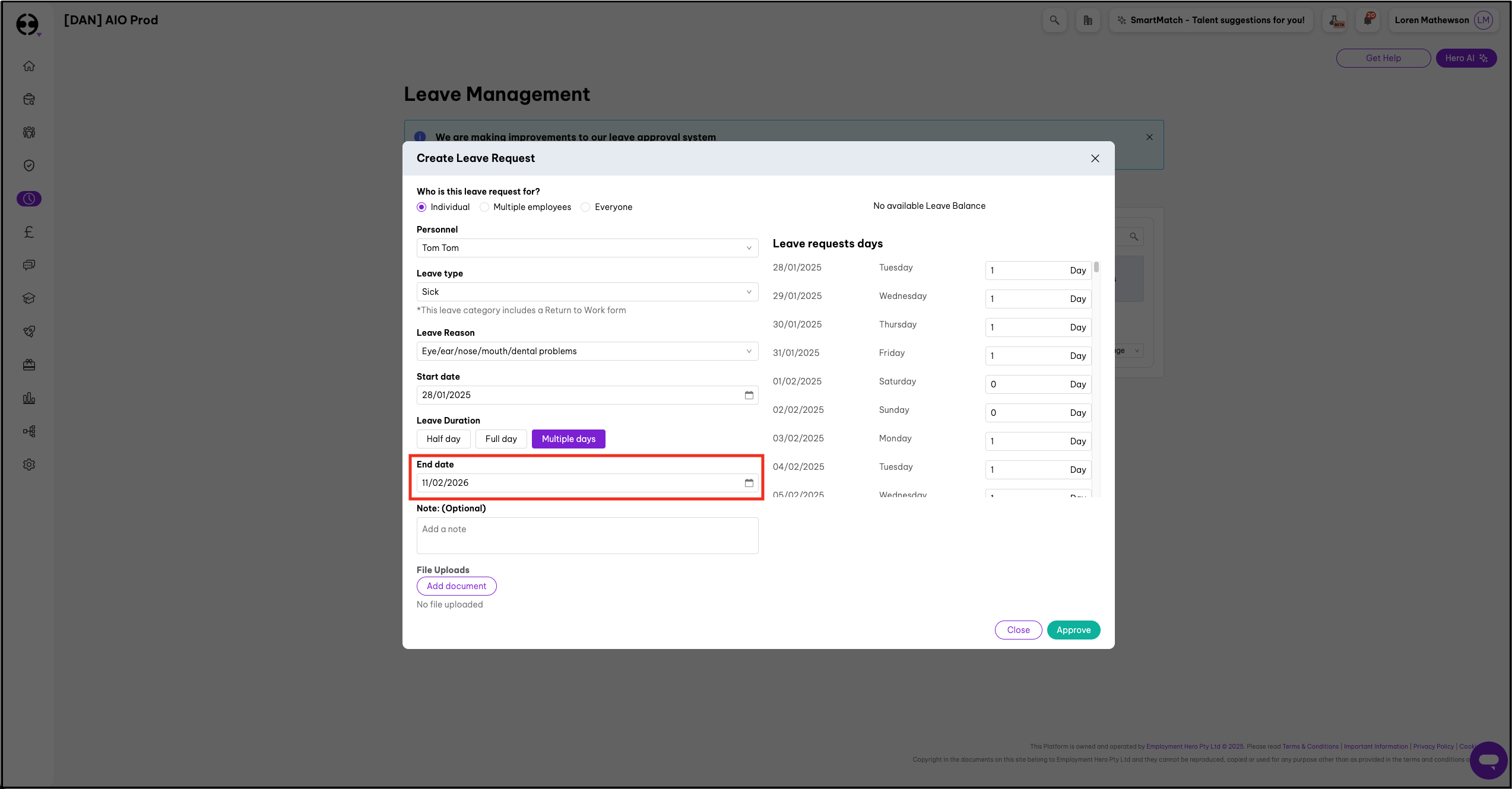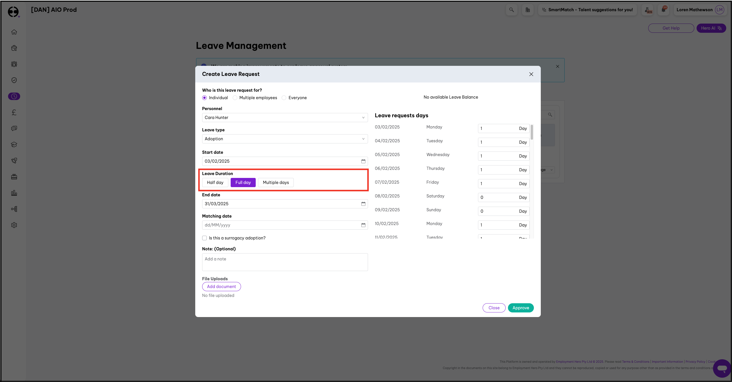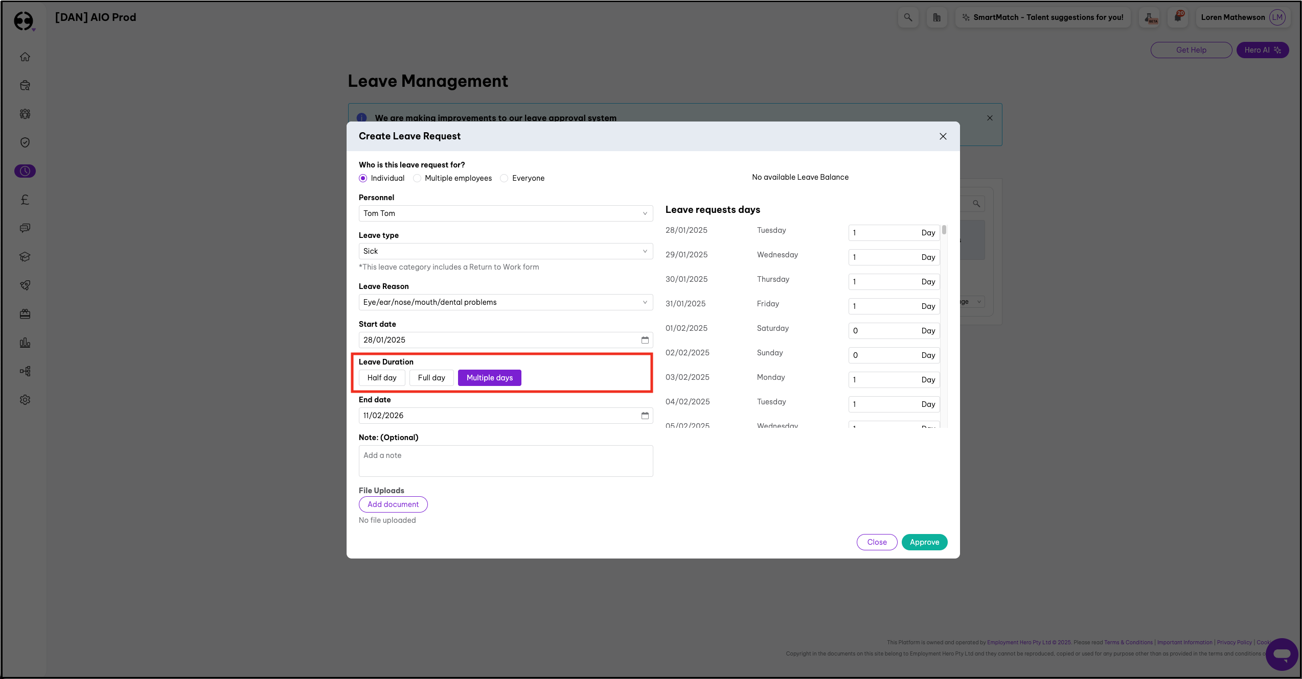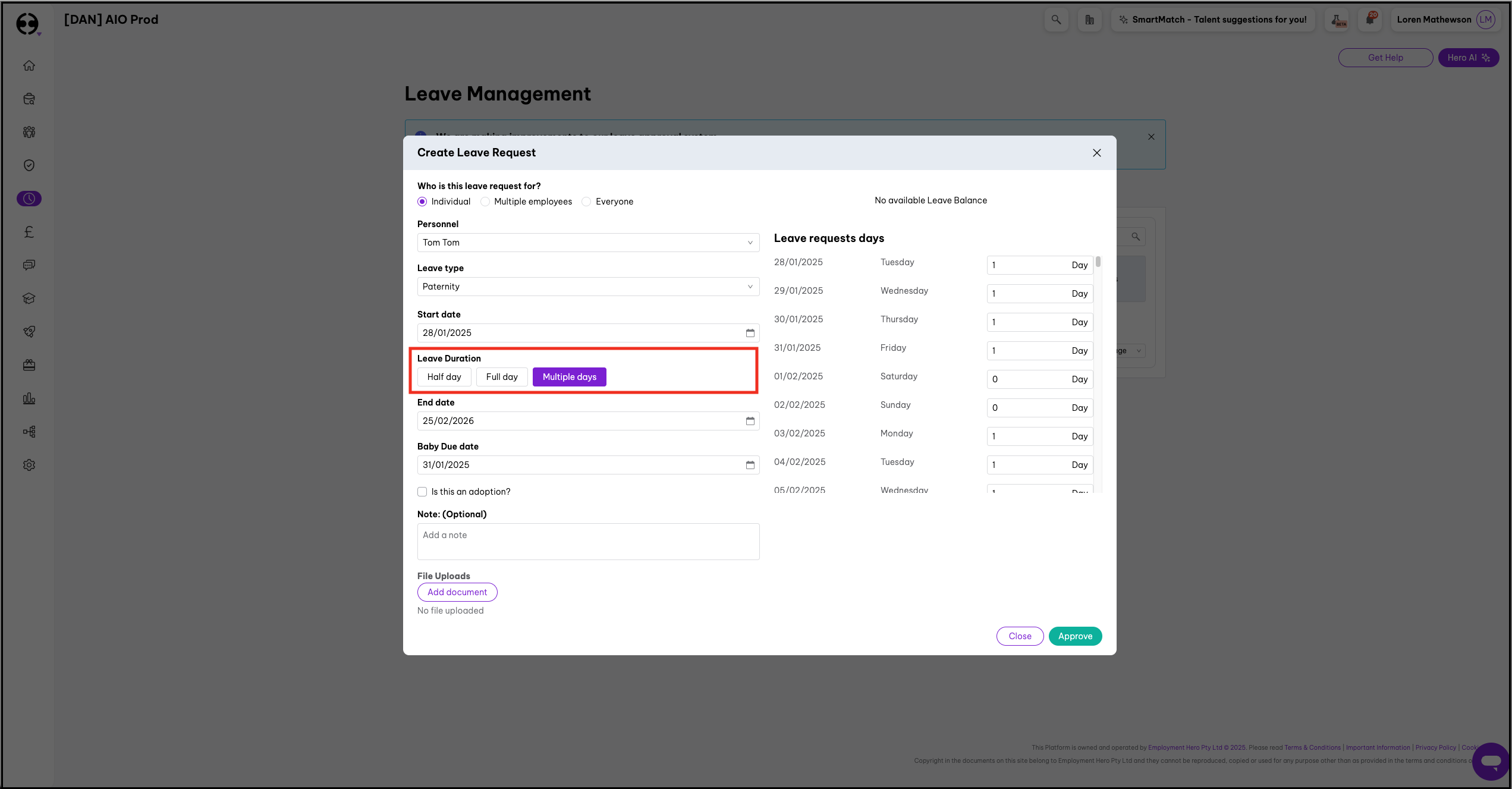 - In the Leave Duration field, select either Half day, Full day, or Multiple days.